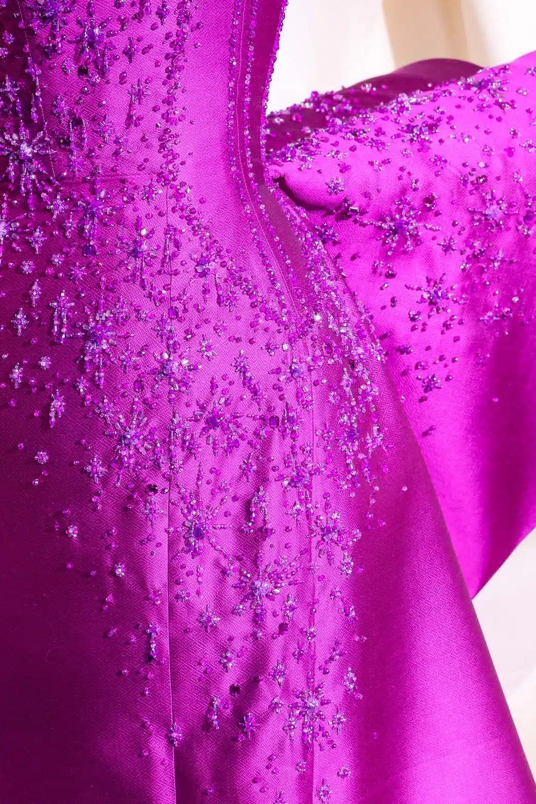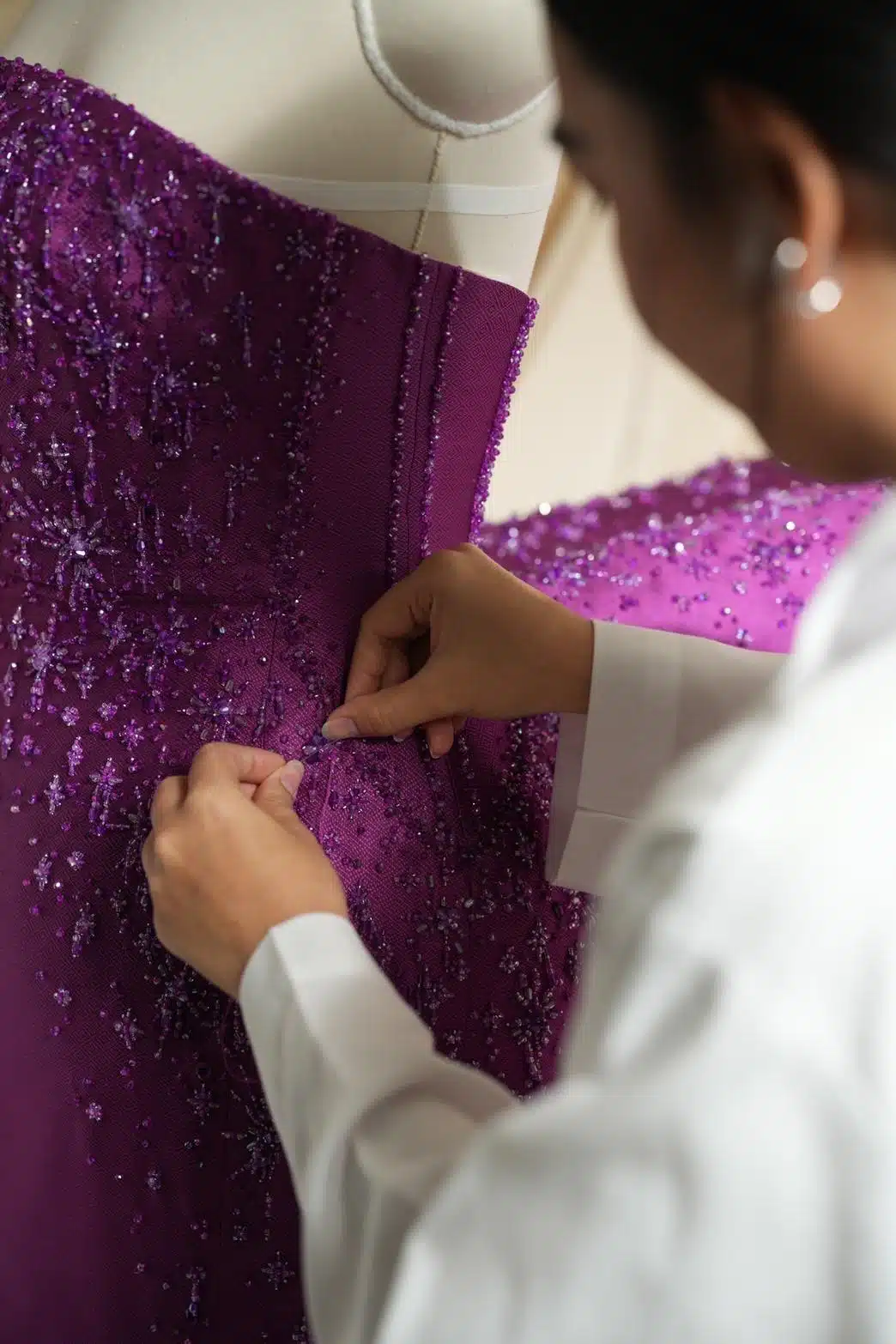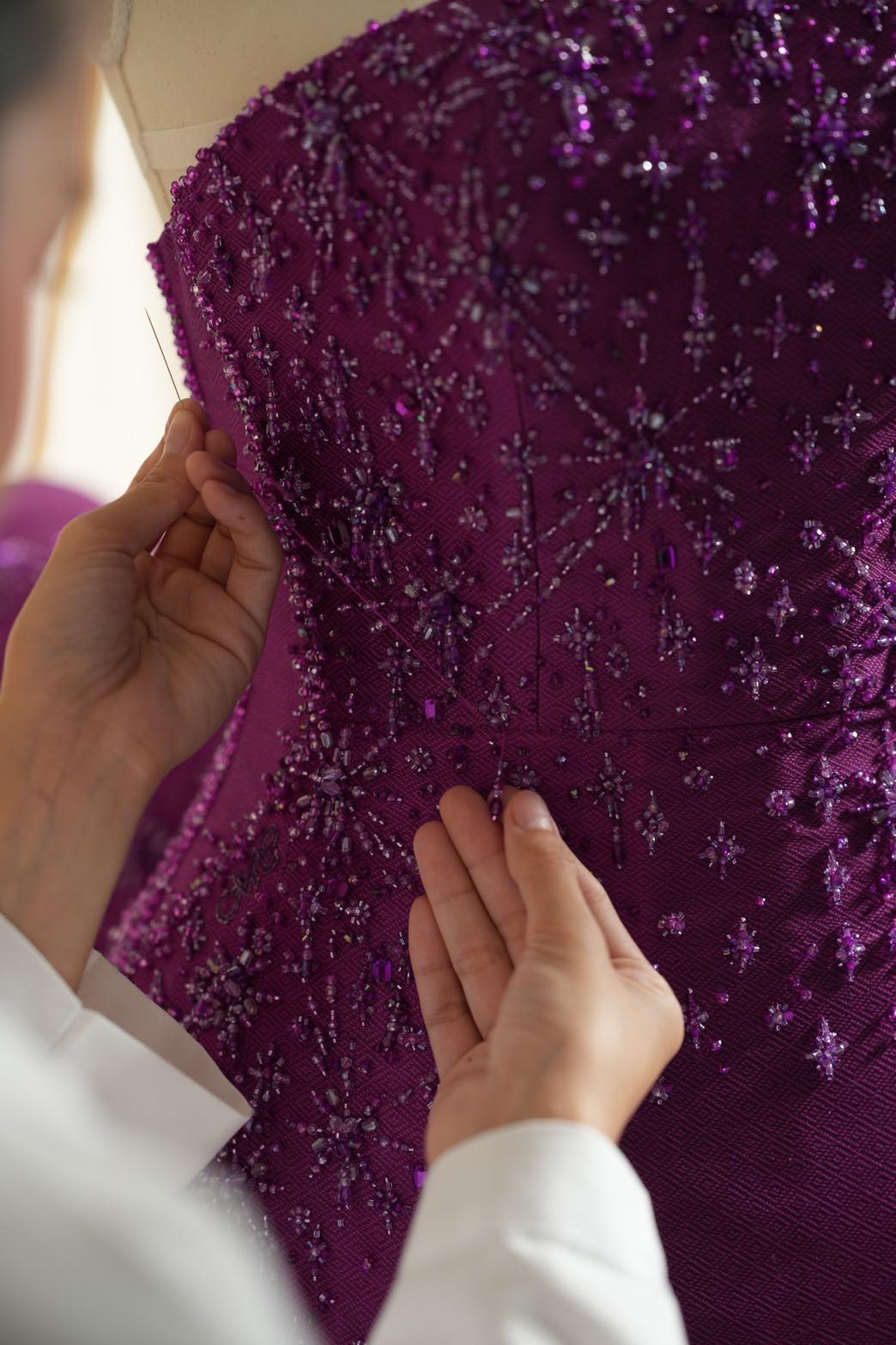 งานปักบนชุดที่เปล่งประกายแสงรับสปอตไลท์บนเวที คืองานปักโดยช่างฝีมือจาก SIRIVANNAVARI Atelier and Academy สตูดิโองานปักชั้นสูงของแบรนด์ ที่ถ่ายทอดแรงบันดาลใจจาก “ดอกรัก” ดอกไม้ร้อยพวงมาลัย ผ่านคริสตัล เลื่อม และแท่งแก้วนับหลายพันชิ้น ปักเรียงต่อกันเป็นลายเส้นสามมิติ บรรจงปักนานนับร้อยชั่วโมง เพิ่มความพิเศษด้วยงานปักตัวอักษรย่อ MC ชื่อของซุปตาร์ดิว่า เพื่อเป็นการต้อนรับและมิตรไมตรีแบบไทยในบริบทร่วมสมัย งานฝีมืออันประณีตในรายละเอียดแห่งงาน Custom Made จากแบรนด์ SIRIVANNAVARI