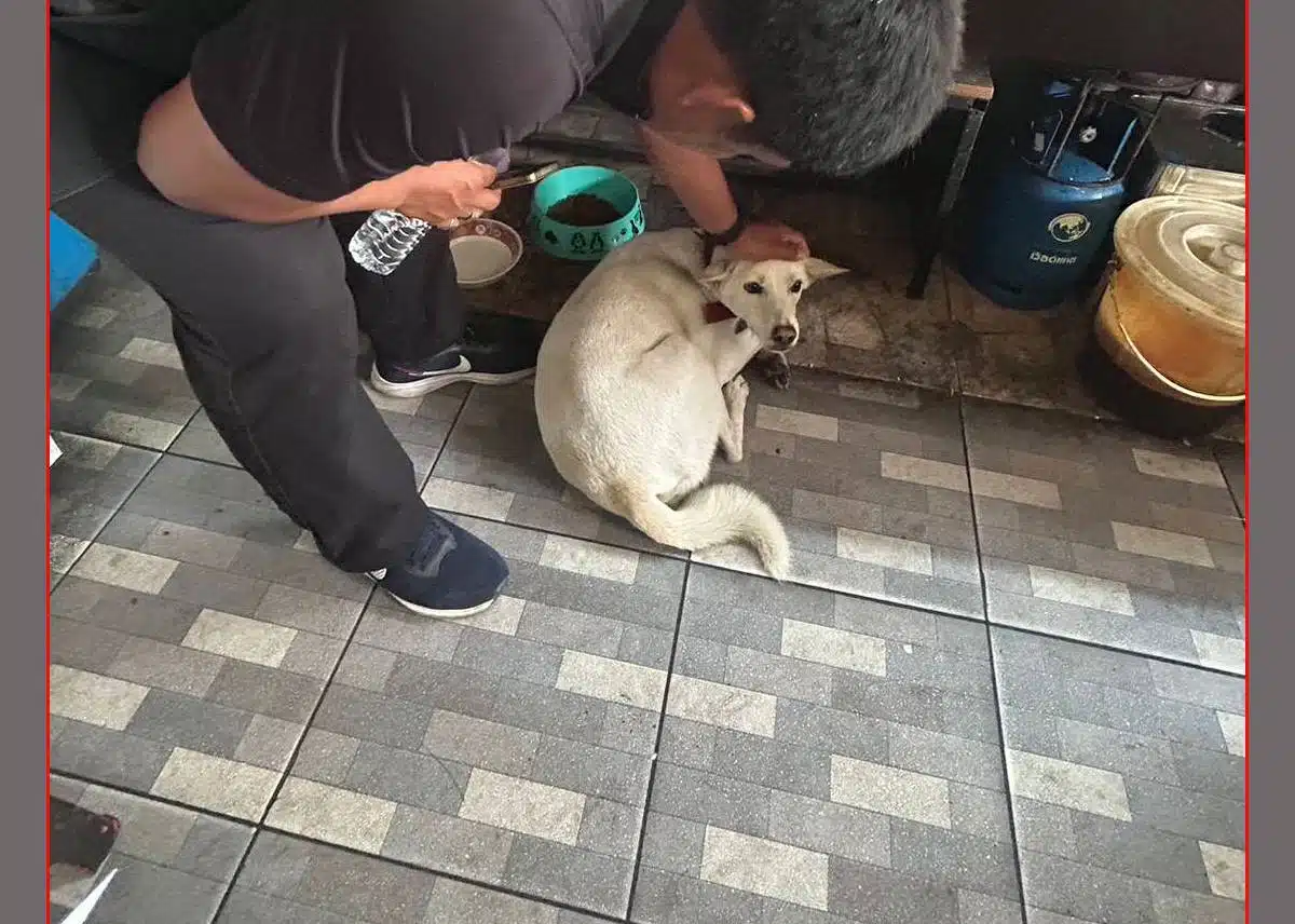 “ขาวนอนอยู่ดีๆหน้าเซเว่นตามปกติ เด็กวิ่งตึงตังเข้ามาผ่านหน้า ขาวตกใจ จึงงับเข้าให้เซเว่น และชาวบ้าน ได้มีการจ่ายเงินชดเชยเงินเยียวยาให้แล้ว และเรื่องก็จบไปแล้ว ไม่คาดว่าคนตีจะคุมแค้นเข้ามาไล่ตีขาวอีกจนขาวตกใจวิ่งหนีไปอยู่ในท่อและแม่ค้าก็ช่วยพาขาวมาแอบที่ร้าน ตำรวจสืบสวน สภ.ปากเกร็ด เข้ามาดูกล้องแล้ว และรู้ตัวคนตีแล้ว เตรียมดำเนินการติดตามจับกุมมาดำเนินคดีให้ถึงที่สุด”
