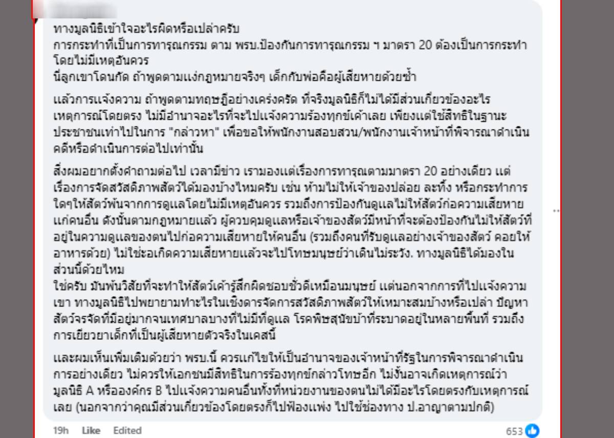 “การไล่ตีหมาของชายผู้เป็นพ่อเป็นการกระทำที่เกิดขึ้นหลังเหตุการณ์หมากัดเด็ก จึงไม่ใช่ทั้งเป็นการป้องกันทรัพย์สิน หรือป้องกันตัว !! เป็นการมาไล่ตีไล่ฟาดเพราะความโกรธแค้นและเจ็บใจซึ่งกฎหมายไม่อนุญาตนะครับ !! ดังนั้นจึงมีการดำเนินคดีทารุณกรรมสัตว์ตามปกติ ไม่ได้มีการถอนแจ้งความแต่อย่างใดอย่างที่เป็นข่าว”