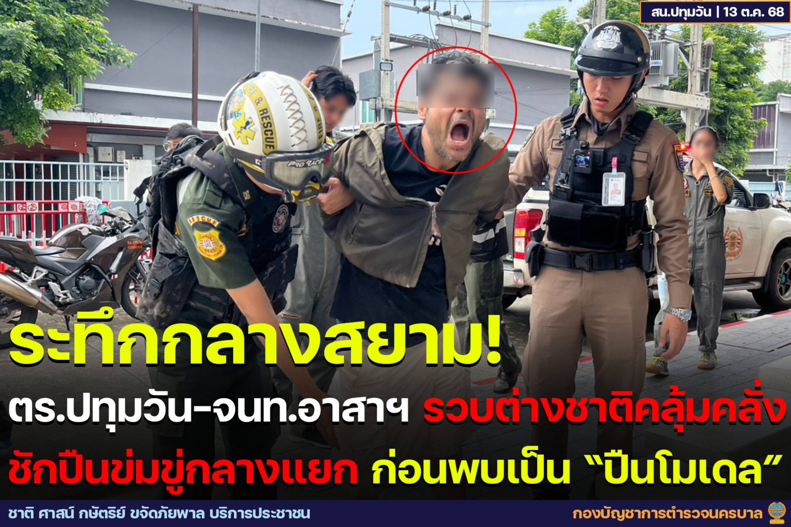 ระทึกกลางสยาม สถานีตำรวจนครบาลปทุมวัน ผนึกกำลังเจ้าหน้าที่อาสาฯ รวบต่างชาติคลุ้มคลั่ง ชักปืนข่มขู่กลางแยก ประชาชนนักท่องเที่ยวแตกตื่นใจกลางเมือง ก่อนพบเป็น “ปืนโมเดล”