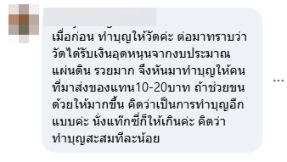 “เมื่อก่อน ทำบุญให้วัดค่ะ ต่อมาทราบว่าวัดได้รับเงินอุดหนุนจากงบประมาณแผ่นดิน รวยมาก จึงหันมาทำบุญให้คนที่มาส่งของแทน10-20บาท ถ้าช่วยขนด้วยให้มากขึ้น คิดว่าเป็นการทำบุญอีกแบบค่ะ นั่งแท๊กซี่ก็ให้เกินค่ะ คิดว่าทำบุญสะสมทีละน้อย”