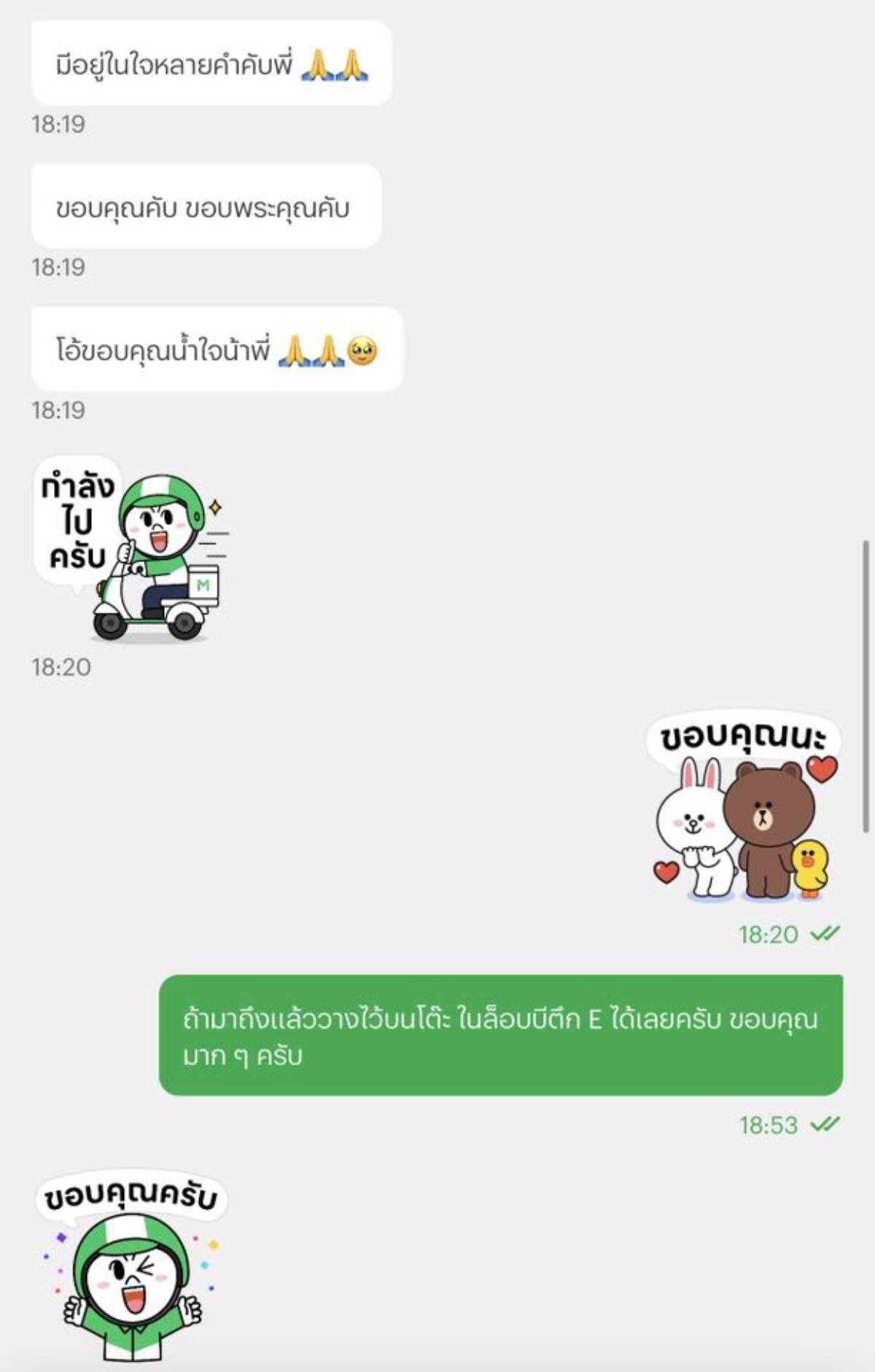 “ด้วยความที่ฝนเพิ่งหยุดตก และถนนก็ลื่น แล้วพี่ไรเดอร์ต้องขับมาถึง 18 โล ด้วยความเกรงใจมาก ๆ เพราะค่าส่งตามระบบคือไม่มากเลย แล้วไรเดอร์ต้องโดนหักเปอร์เซ็นต์อีก เลยโอนทิปให้เพิ่ม เหมือนปกติทุกครั้งที่เคยทำเวลาเรารู้สึกว่าเป็นงานยาก ๆ สำหรับไรเดอร์ แต่ครั้งนี้พี่ไรเดอร์ทำให้เรารู้สึกว่า เขาขอบคุณ และซาบซึ้งจริง ๆ เหมือนเราทำให้วันนี้ของเขาได้เจอเรื่องดี ๆ อ่านจากข้อความพี่เขา เราเองก็รู้สึกดีใจไปด้วยที่พี่เขารู้สึกดีขนาดนี้”