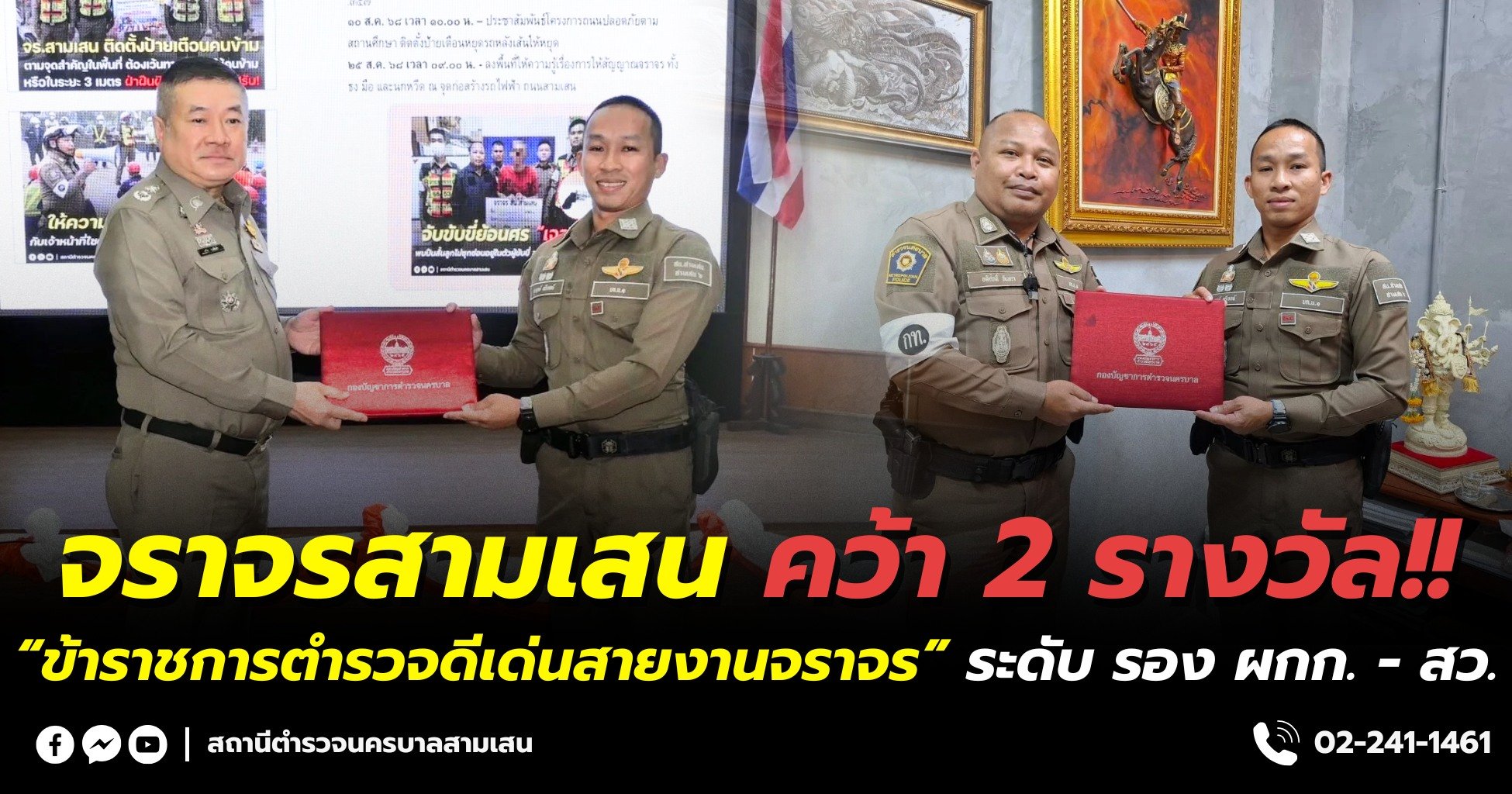 ทั้งนี้ รองทราย พ.ต.ท.ศุภฤกษ์ ตรีเจตน์ รองผกก.จร.สน.สามเสน เคยได้รับรางวัลสุภาพบุรุษจราจรดีเด่น ตามโครงการสุภาพบุรุษจราจร ประชาชนสัญจรปลอดภัย ประจำปีงบประมาณ พ.ศ. 2567 รวมถึงสดๆ ร้อนๆ เมื่อ 10 ก.ย.ที่ผ่านมา ยังได้รางวัลเชิดชูเกียรติ ข้าราชการตำรวจดีเด่นสายงานจราจร ถือเป็นความภาคภูมิใจของ งานจราจร สน.สามเสนและเป็นกำลังใจในการปฏิบัติหน้าที่เพื่อความปลอดภัยของพี่น้องประชาชนด้วยดีเสมอมา.