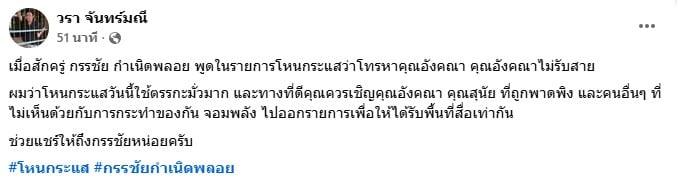 นายวรา ระบุว่า “เมื่อสักครู่ กรรชัย กำเนิดพลอย พูดในรายการโหนกระแสว่าโทรหาคุณอังคณา คุณอังคณาไม่รับสาย ผมว่าโหนกระแสวันนี้ใช้ตรรกะมั่วมาก และทางที่ดีคุณควรเชิญคุณอังคณา คุณสุนัย ที่ถูกพาดพิง และคนอื่นๆ ที่ไม่เห็นด้วยกับการกระทำของกัน จอมพลัง ไปออกรายการเพื่อให้ได้รับพื้นที่สื่อเท่ากัน ช่วยแชร์ให้ถึงกรรชัยหน่อยครับ”