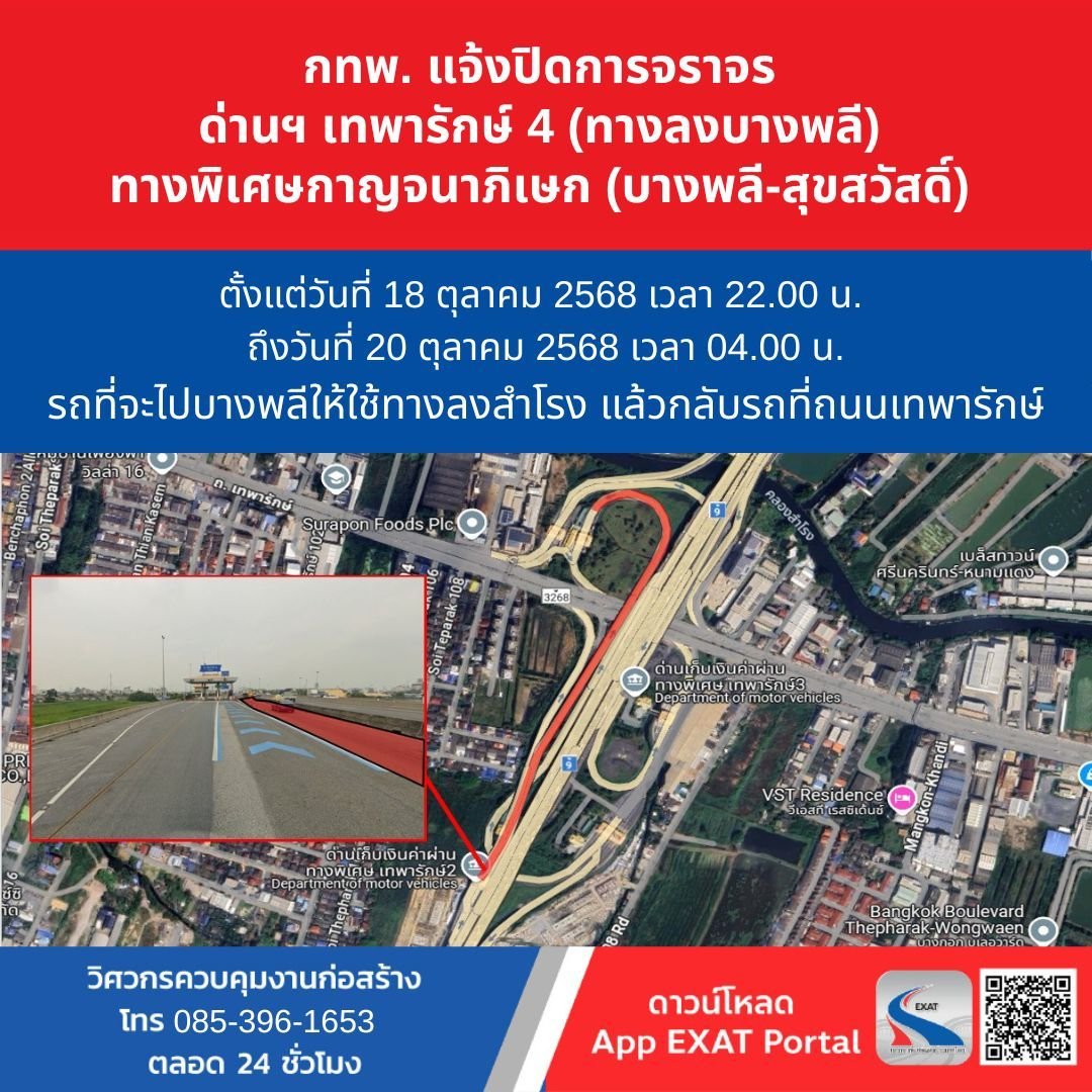 การทางพิเศษแห่งประเทศไทย (กทพ.) กระทรวงคมนาคม ได้ว่าจ้างบริษัท ซีโก้ทรานสปอร์ต จำกัด เพื่อดำเนินงานปรับปรุงผิวจราจรถนนบริการ ในเขตทางพิเศษกาญจนาภิเษก (บางพลี-สุขสวัสดิ์) โดยบริษัทฯ จะเข้าดำเนินงานปรับปรุงผิวจราจรดังกล่าว จึงมีความจำเป็นจะต้องปิดการจราจรทางพิเศษกาญจนาภิเษก (บางพลี – สุขสวัสดิ์) บริเวณด่านเก็บค่าผ่านทางพิเศษเทพารักษ์ 4 (ทางลงบางพลี) ตั้งแต่วันที่ 18 ตุลาคม 2568 เวลา 22.00 น. ถึงวันที่ 20 ตุลาคม 2568 เวลา 04.00 น. โดยรถที่จะไปบางพลีให้ใช้ทางลงสำโรง แล้วกลับรถที่ถนนเทพารักษ์