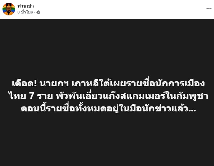เพจเฟซบุ๊ก ท่านเปา โพสต์ข้อความระบุว่า “เดือด! นายกฯ เกาหลีใต้เผยรายชื่อนักการเมืองไทย 7 ราย พัวพันเอี่ยวแก๊งสแกมเมอร์ในกัมพูชา ตอนนี้รายชื่อทั้งหมดอยู่ในมือนักข่าวแล้ว…”