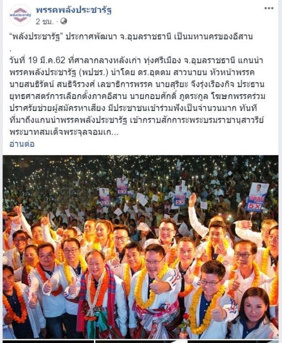 พลังประชารัฐโป๊ะแตก – กลายเป็นเรื่องร้อนแรงเมื่อกลางดึกของวันที่ 19 มี.ค. ที่ผ่านมา เมื่อเฟซบุ๊กเพจ พรรคพลังประชารัฐ ลงภาพตอนแกนนำพรรคปราศรัย ที่ศาลากลางหลังเก่า ทุ่งศรีเมือง จ.อุบลราชธานี มีฉากหลังเป็นคลื่นมหาชนชาวอุบลที่มาฟังปราศรัยเป็นจำนวนมาก