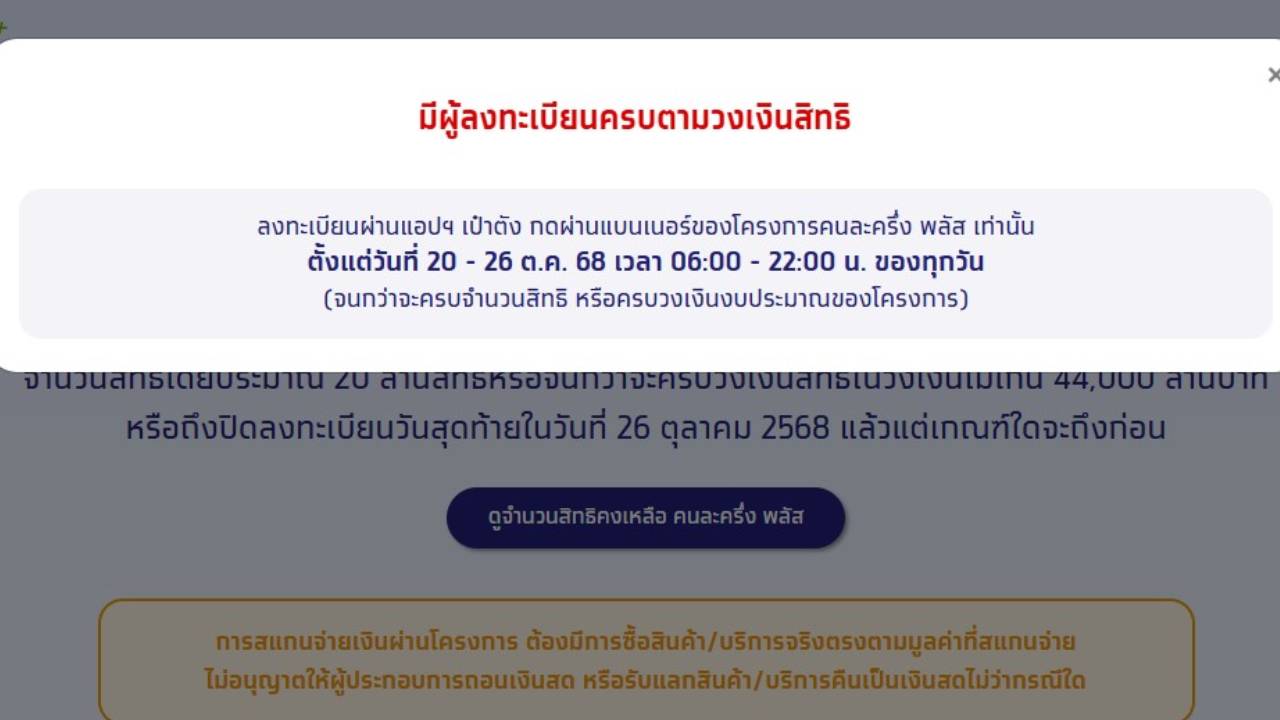 “คนละครึ่งพลัส” สิทธิเต็มแล้ว หลังคนแห่ลงทะเบียนครบ 20 ล้านในวันแรก ใครที่ขึ้นสถานะรอผล ไม่ต้องกังวล ส่วนคนที่ได้สิทธิ์ อย่าลืมใช้ครั้งแรกก่อน 11 พ.ย. นี้
