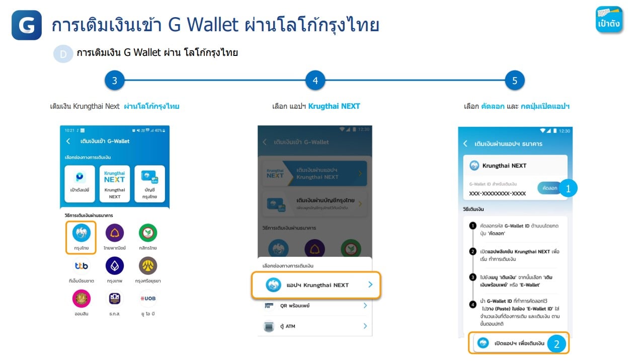 เริ่มแรกเข้าแอปฯ “เป๋าตัง” จากนั้นเลือกเมนู “G Wallet” และกดปุ่ม “เติมเงินเข้า G Wallet” ระบบจะแสดงช่องทางในการเติมเงิน ดังนี้