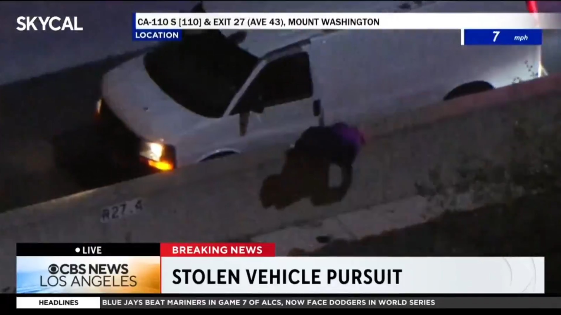 เหตุการณ์ดังกล่าวเกิดขึ้นเมื่อวันจันทร์ที่ผ่านมา (20 ตุลาคม) ในขณะที่เฮลิคอปเตอร์ของช่อง CBS Los Angeles กำลังบันทึกภาพตำรวจไล่ล่าผู้ต้องสงสัยคดีขโมยรถตู้สีขาวในย่านไชนาทาวน์ ผู้ต้องสงสัยได้ขับรถหนีขึ้นทางด่วน 110 Freeway ก่อนจะชะลอรถเกือบหยุดนิ่ง