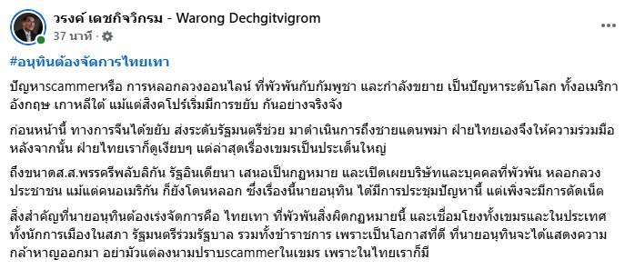 นพ.วรงค์ ระบุว่า “ปัญหา scammer หรือ การหลอกลวงออนไลน์ ที่พัวพันกับกัมพูชา และกำลังขยาย เป็นปัญหาระดับโลก ทั้งอเมริกา อังกฤษ เกาหลีใต้ แม้แต่สิงคโปร์เริ่มมีการขยับ กันอย่างจริงจัง