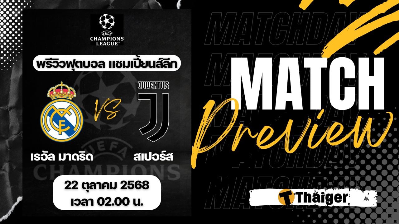 22 ตุลาคม 68 ดูบอลสด ฟุตบอล ยูฟ่า แชมเปี้ยนส์ ลีก รอบลีกเฟส นัดที่ 3 ระหว่าง เรอัล มาดริด พบ ยูเวนตุส ที่สนาม ซานติอาโก้ เบร์นาเบว เวลา 02:00 น. ตามเวลาประเทศไทย พร้อมถ่ายทอดสด