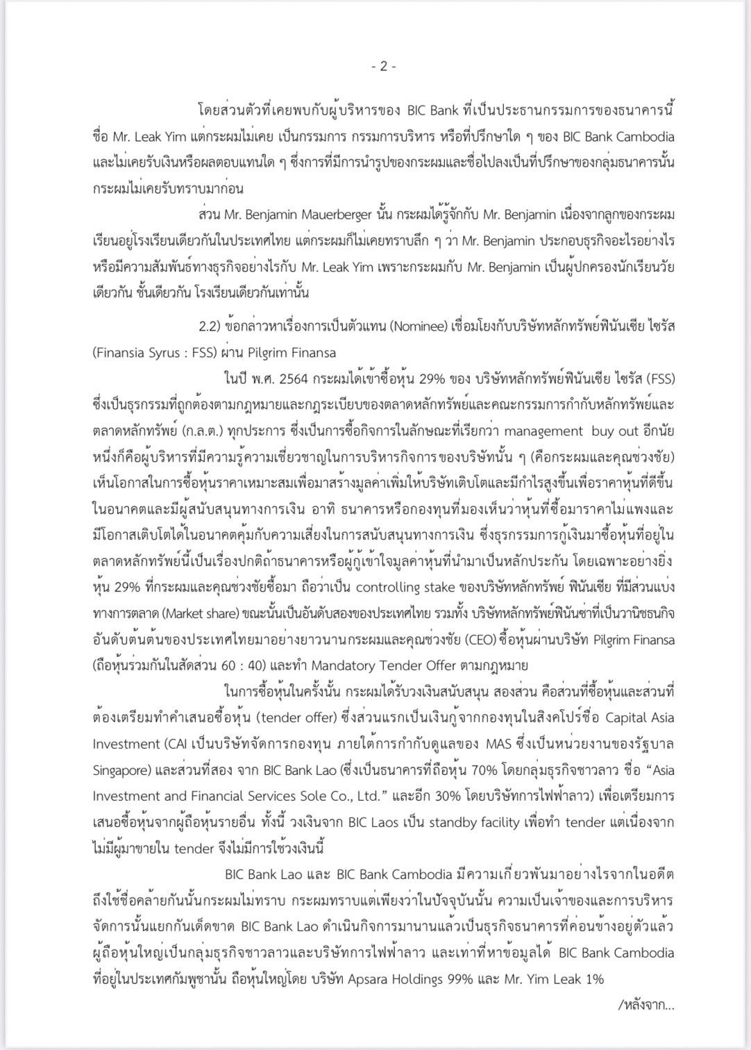 โดยส่วนตัวที่เคยพบกับผู้บริหารของ BIC Bank ที่เป็นประธานกรรมการของธนาคารนี้ ชื่อ Mr. Leak Yim แต่กระผมไม่เคย เป็นกรรมการ กรรมการบริหาร หรือที่ปรึกษาใด ๆ ของ BIC Bank Cambodia และไม่เคยรับเงินหรือผลตอบแทนใด ๆ ซึ่งการที่มีการนำรูปของกระผมและชื่อไปลงเป็นที่ปรึกษาของกลุ่มธนาคารนั้น กระผมไม่เคยรับทราบมาก่อน