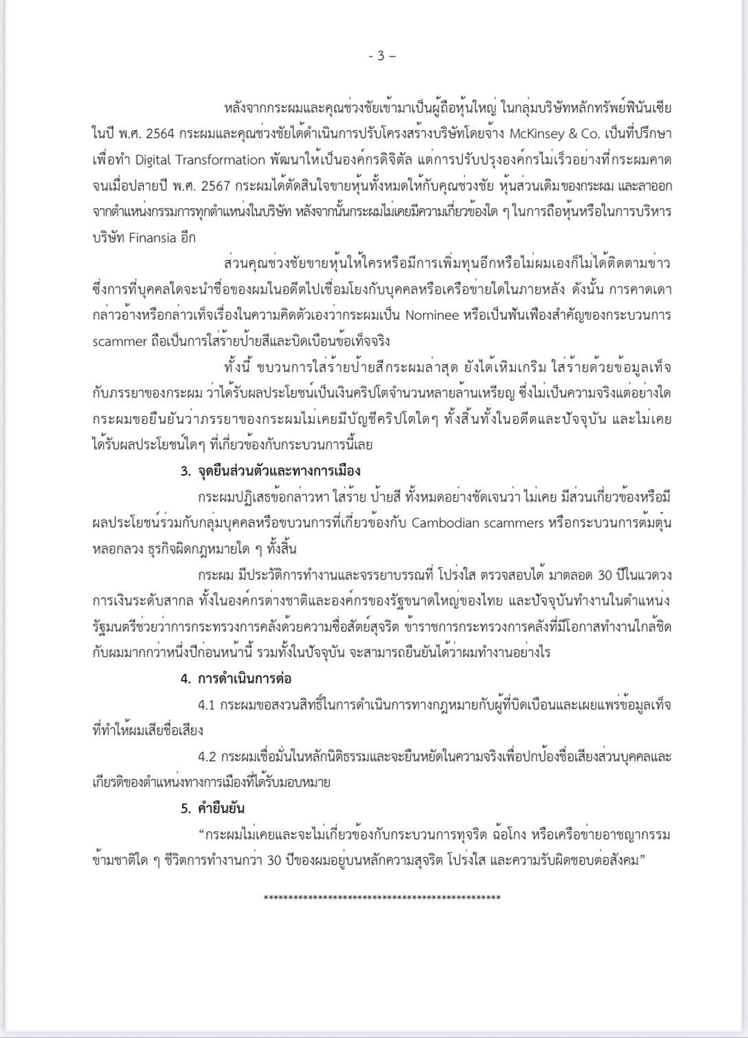 3. จุดยืนส่วนตัวและทางการเมือง กระผมปฏิเสธข้อกล่าวหา ใส่ร้าย ป้ายสี ทั้งหมดอย่างชัดเจนว่า ไม่เคย มีส่วนเกี่ยวข้องหรือมี ผลประโยชน์ร่วมกับกลุ่มบุคคลหรือขบวนการที่เกี่ยวข้องกับ Cambodian scammers หรือกระบวนการต้มตุ๋น หลอกลวง ธุรกิจผิดกฎหมายใด ๆ ทั้งสิ้น