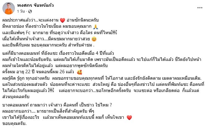 “ผมประกาศแล้วว่า…จะเเต่งงาน อ่านซักนิดนะครับ มีหลายช่องที่ลงข่าวในโซเชียล ผมขอบคุณมาก เเละมีเเฟน ๆ Fc มากมาย ที่รอดูว่าเจ้าสาว คือใคร คนที่ไหน เมื่อได้เห็นหน้าเจ้าสาว….มีคนชมมากมายว่าสวย และยินดีกับผม ขอบคุณมากนะครับสำหรับคำชม