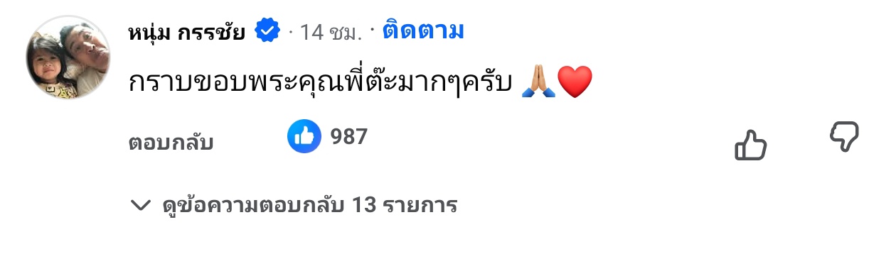 ต่อมาใต้โพสต์ดังกล่าว มีผู้เข้ามีแสดงความคิดเห็นจำนวนมาก รวมถึงหนุ่ม กรรชัย เอง เข้ามาคอมเมนต์ตอบกลับว่า “กราบขอบพระคุณพี่ต๊ะมากๆครับ”