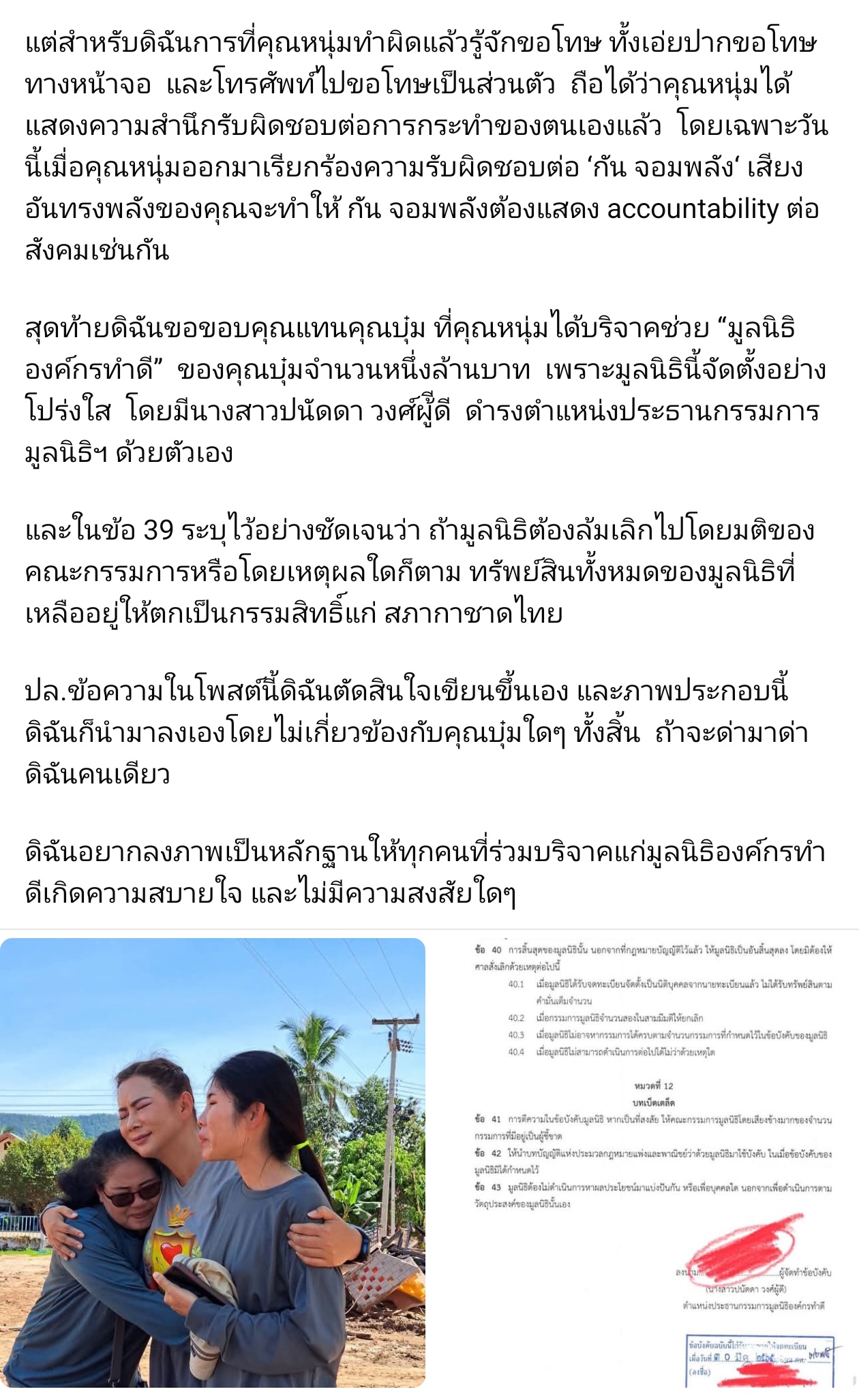 ดิฉันอ่านข่าวที่คุณหนุ่มเรียกร้องให้ ’กัน จอมพลัง’ ออกมาเคลียร์เรื่องเงินบริจาค โดยเฉพาะยอดเงินหนึ่งล้านบาทที่คุณหนุ่มโอนให้กันโดยตรง และหลังจากนั้นคุณหนุ่มโอนให้อีกห้าแสนบาท หลังจากที่มีการจดจัดตั้งมูลนิธิกัน จอมพลัง