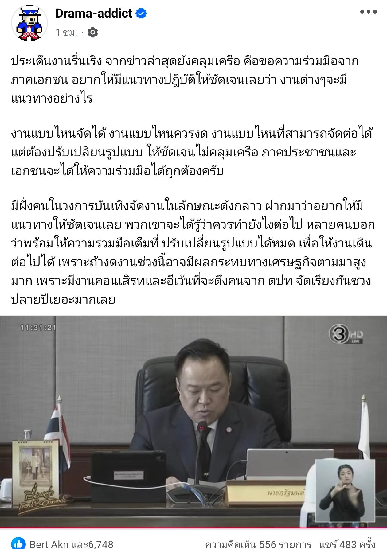 เพจดัง Drama-addict ตั้งคำถาม แนวปฏิบัติ ไว้ทุกจ์ งดงานรื่นเริง 30 วัน ของ มติ ครม. รัฐบาล ยังคลุมเครือ วงการอีเวนต์จี้ขอความชัดเจน อะไรจัดได้ ไม่ได้