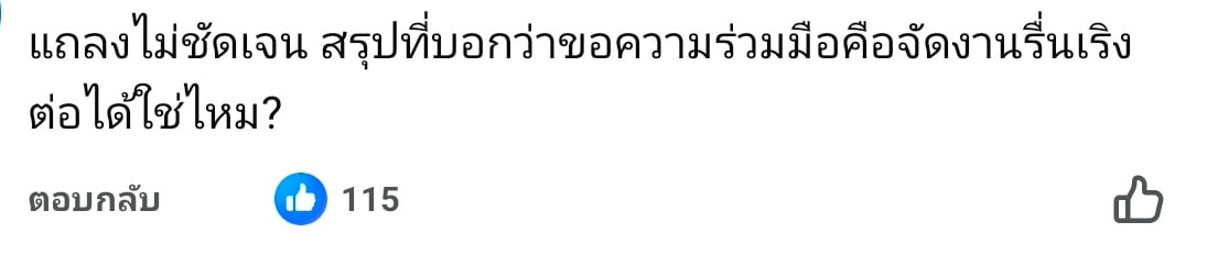 เพจดังระบุว่า อยากให้รัฐบาลมีแนวทางปฏิบัติออกมาให้ชัดเจนว่า งานลักษณะใดสามารถจัดได้ งานลักษณะใดควรงด หรือ งานลักษณะใดที่สามารถจัดต่อได้ แต่ต้องปรับเปลี่ยนรูปแบบ