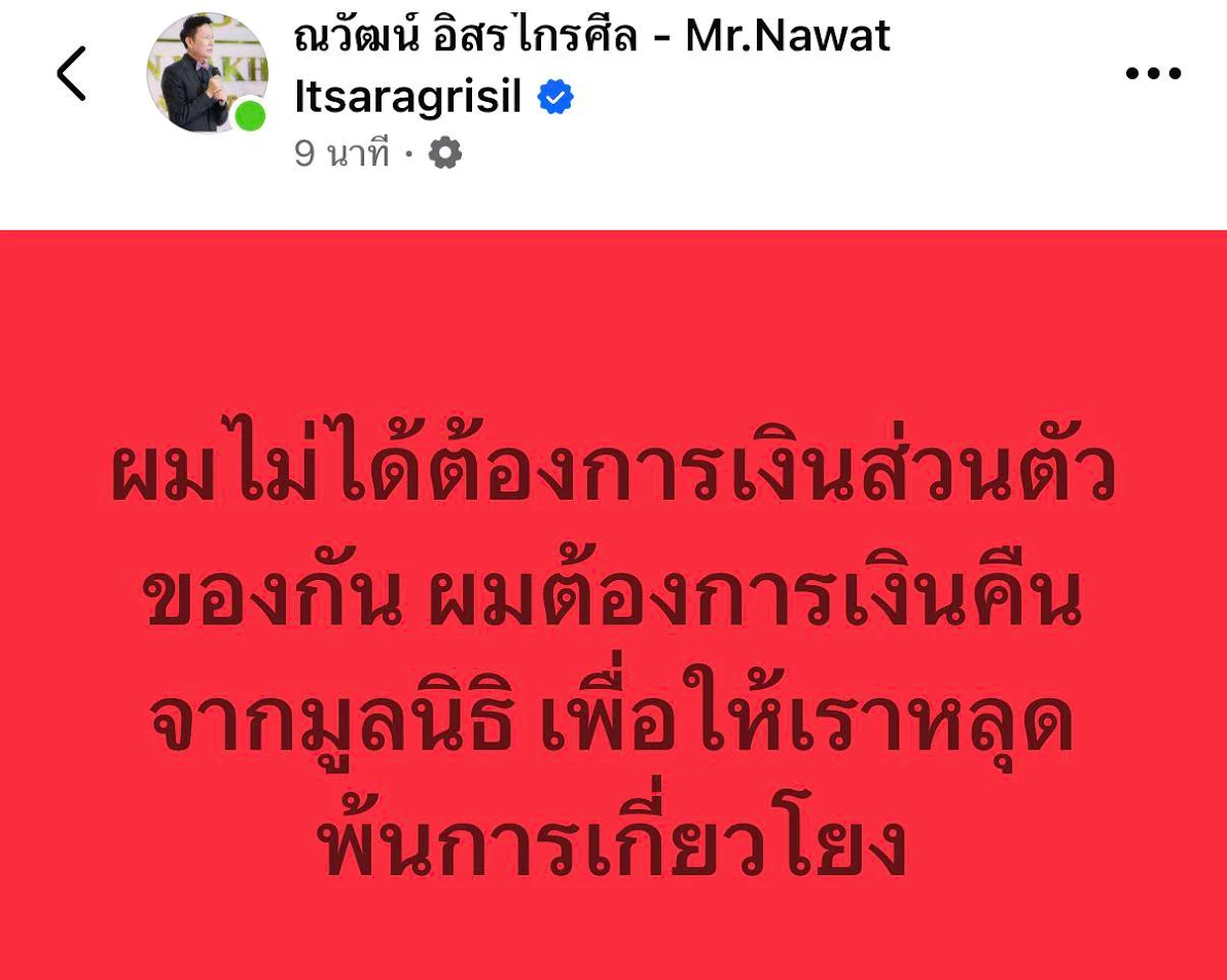 ส่วนด้านบอสณวัฒน์ ได้โพสต์ข้อความผ่านเฟซบุ๊ก เช่นเดียวกันว่า “ผมไม่ได้ต้องการเงินส่วนตัวของกัน ผมต้องการเงินคืนจากมูลนิธิ เพื่อให้เราหลุดพ้นการเกี่ยวโยง” และระบุเพิ่มเติมในคอมเมนต์ว่า “ผมได้แจ้งไปชัดเจนแล้วว่าผมไม่รับเงินส่วนตัวมันไม่ถูกต้องตามกฎหมายของบริษัทมหาชน ผมมีสิทธิ์ผมชอบอะไรที่ตรงไปตรงมาให้ใครไปคนนั้นก็เอามาคืน ให้ระวังทุกคอมเม้นต์นะครับผมเป็นคนพูดชัดเจนว่าเงินจะต้องกลับมาจากมูลนิธิเท่านั้น”