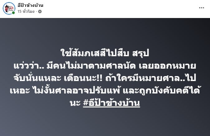ท่ามกลางความสงสัย เพจดังอย่าง อีป้าข้างบ้าน ก็ได้ออกมาโพสต์ข้อความให้ขาเมาท์ได้ตามต่อ โดยระบุว่า “บอสบิ๊กโพสต์หมายจับ.. เกิดอะไรขึ้นนะ แปรงฟันแปป เดี๋ยวเล่า” ก่อนจะโพสต์อีกครั้งว่า “ใช้สัมภเสสีไปสืบ สรุปแว่วว่า.. มีคนไม่มาตามศาลนัด เลยออกหมายจับนั่นแหละ เตือนนะ ถ้าใครมีหมายศาล..ไปเหอะ ไม่งั้นศาลอาจปรับแพ้ และถูกบังคับคดีได้นะ”