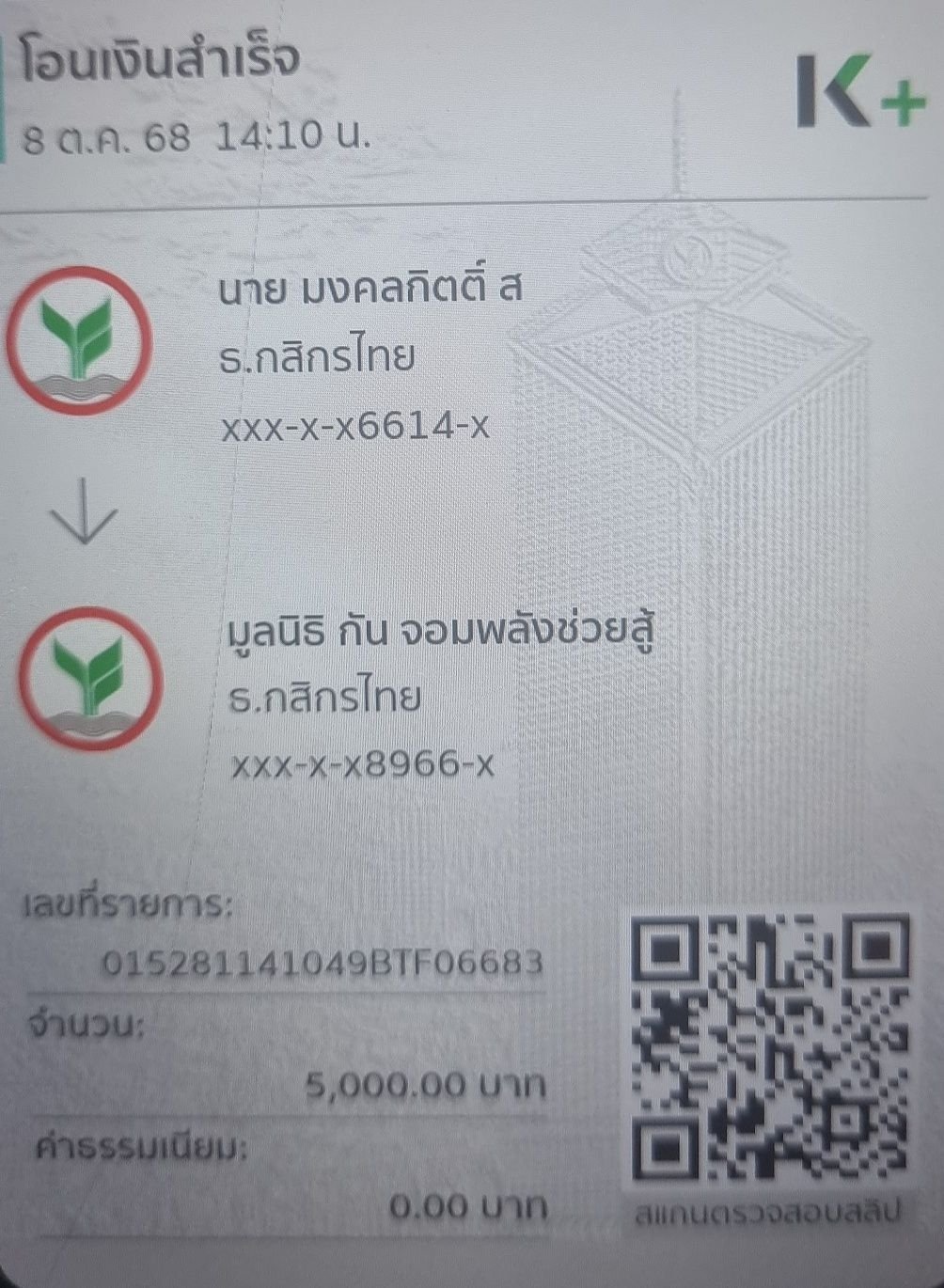 นายมงคลกิตติ์ สุขสินธารานนท์ อดีต สส.พรรคไทยศรีวิไลย์ และอดีตที่ปรึกษาหัวหน้าพรรคประชาธิปัตย์ ได้โพสต์ข้อความเฟซบุ๊ก ขอเงินบริจาคจากมูลนิธิกันจอมพลังช่วยสู้คืนอีกครั้ง โดยระบุว่า “เดิม ผมตั้งใจสนับสนุน โอนให้ คุณกัน จอมพลัง ตัวจริง ไปช่วยซื้อตู้คอนเทรนเนอร์กั้นชายแดนไทย-กัมพูชา เมื่อ 8 ต.ค.68 จำนวน 5,000 บาท โดยคิดว่า คุณกัน เป็น ประธานมูลนิธิ จึงเชื่อใจ สนับสนุนไป
