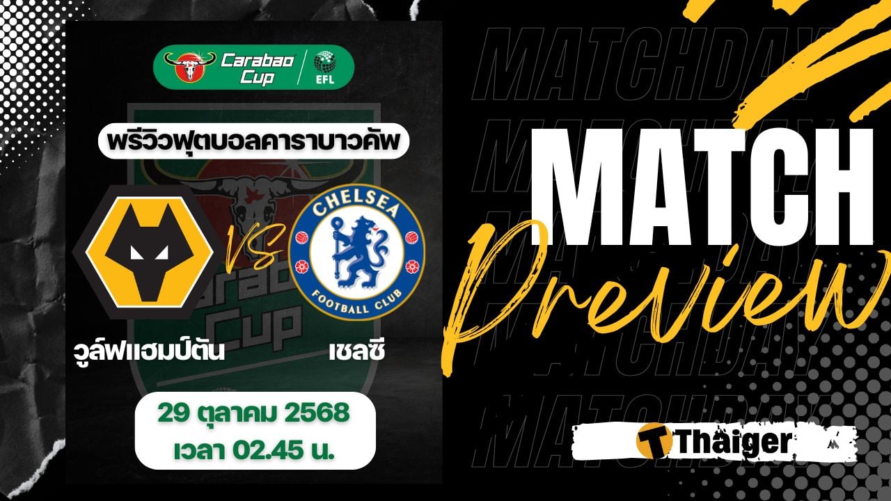 29 ตุลาคม 2568 เวลา 02.45 น. ถ่ายทอดสด ดูบอลสด ฟุตบอล คาราบาว คัพ ฤดูกาล 2025/26 รอบ 4 ที่สนาม โมลินิวซ์ สเตเดี้ยม วูล์ฟแฮมป์ตัน พบ เชลซี The Thaiger พาไปวิเคราะห์เกม พร้อมการทำนายผล และคาดการณ์ 11 ตัวจริงได้ที่นี่