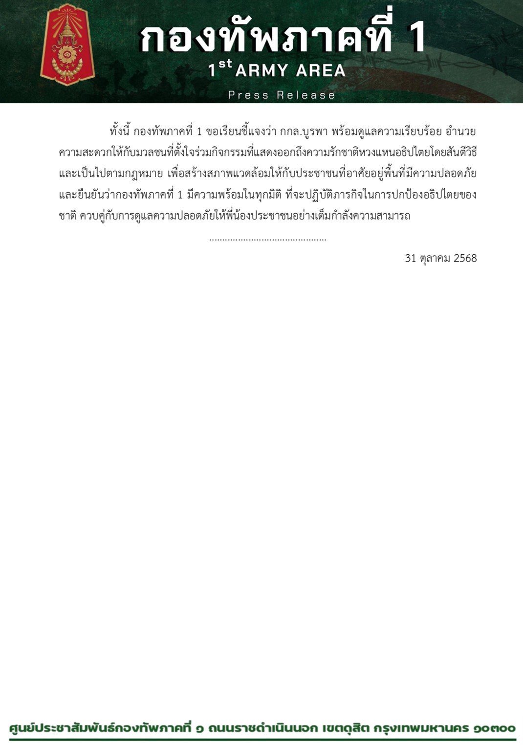 ทั้งนี้ กองทัพภาคที่ 1 ขอเรียนชี้แจงว่า กกล.บูรพา พร้อมดูแลความเรียบร้อย อำนวยความสะดวกให้กับมวลชนที่ตั้งใจร่วมกิจกรรมที่แสดงออกถึงความรักชาติหวงแหนอธิปไตยโดยสันตีวิธี และเป็นไปตามกฎหมาย เพื่อสร้างสภาพแวดล้อมให้กับประชาชนที่อาศัยอยู่พื้นที่มีความปลอดภัย และยืนยันว่ากองทัพภาคที่ 1 มีความพร้อมในทุกมิติ ที่จะปฏิบัติภารกิจในการปกป้องอธิปไตยของชาติ ควบคู่กับการดูแลความปลอดภัยให้พี่น้องประชาชนอย่างเต็มกำลังความสามารถ