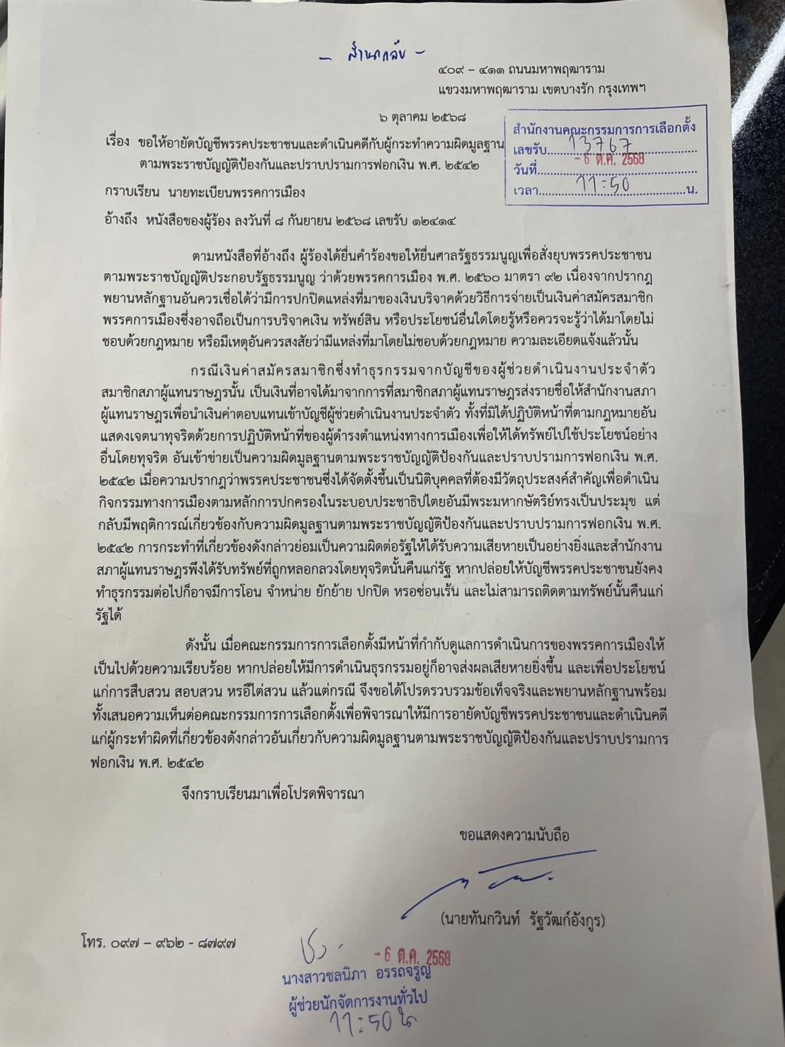 ดังนั้น เมื่อคณะกรรมการการเลือกตั้งมีหน้าที่กำกับดูแลการดำเนินการของพรรคการเมืองให้เป็นไปด้วยความเรียบร้อย หากปล่อยให้มีการดำเนินธุรกรรมอยู่ก็อาจส่งผลเสียหายยิ่งขึ้น และเพื่อประโยชน์แก่การสืบสวน สอบสวน หรือไต่สวน แล้วแต่กรณี จึงขอได้โปรดรวบรวมข้อเท็จจริงและพยานหลักฐานพร้อมทั้งเสนอความเห็นต่อคณะกรรมการการเลือกตั้งเพื่อพิจารณาให้มีการอายัดบัญชีพรรคประชาชนและดำเนินคดีแก่ผู้กระทำผิดที่เกี่ยวข้องดังกล่าวอันเกี่ยวกับความผิดมูลฐานตามพระราชบัญญัติป้องกันและปราบปรามการฟอกเงิน พ.ศ. 2542″