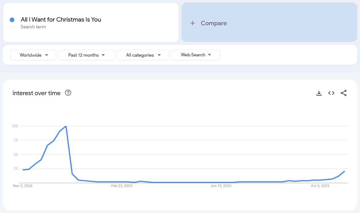 ปฏิเสธไม่ได้ว่า เมื่อเข้าสู่ช่วงปลายปี ไม่ว่าจะไปห้างสรรพสินค้าหรือร้านกาแฟที่ไหน เพลงนี้ก็จะถูกเปิดวนชนิดที่เรียกว่าเป็นบำนาญปลายปี ของแม่หมี ซึ่งจากข้อมูล Google Trends ทั่วโลก พบว่ายอดค้นหาเพลงนี้เริ่มกลับมาไต่ระดับสูงขึ้นตั้งแต่เดือนสิงหาคมที่ผ่านมา ทั้งที่กราฟเพิ่งนิ่งสงบไปเมื่อเดือนมกราคม