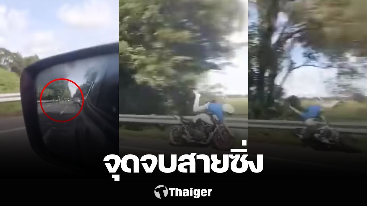จุดจบสายซิ่ง ยืนขับมอเตอร์ไซค์ สุดท้ายรถสะบัดชนแบริเออร์ กระเด็นลงข้างทาง