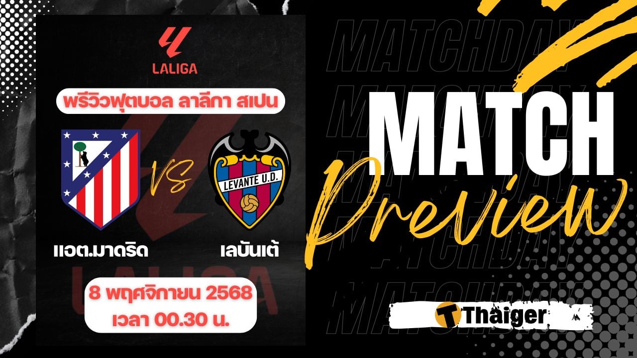 8 พฤศจิกายน 2568 เวลา 00.30 น. ถ่ายทอดสด ดูบอลสด ฟุตบอล ลาลีกา สเปน ฤดูกาล 2025/26 ที่สนาม ริยาห์ด แอร์ เมโทรโปลิตาโน่ แอต.มาดริด พบ เลบันเต้ The Thaiger พาไปวิเคราะห์เกม พร้อมการทำนายผล และคาดการณ์ 11 ตัวจริงได้ที่นี่