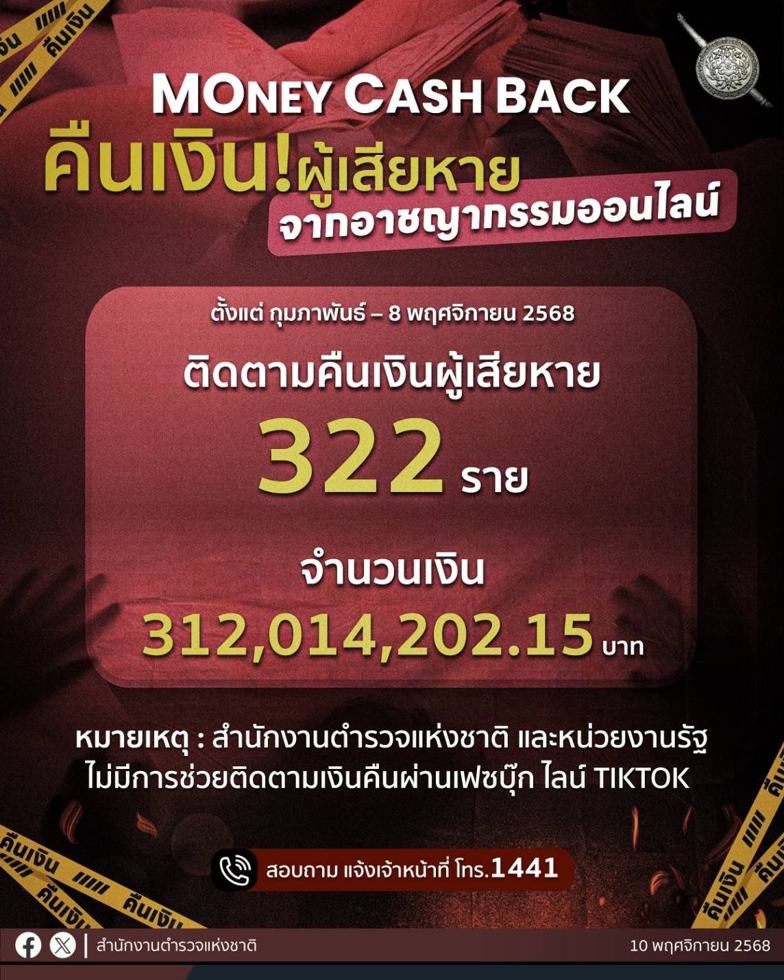 โดยในวันนี้มีผู้เสียหายเดินทางมารับเงินคืนในงานแถลงข่าว รวมจำนวน 31 ราย เป็นเงินรวม 14,604,248 บาท (ทั้งนี้ ตั้งแต่เริ่มโครงการ Money Cash Back กุมภาพันธ์ 2568-ปัจจุบัน สามารถคืนเงินให้กับผู้เสียหายได้ 322 ราย เป็นจำนวนเงินรวม 312,014,202.15 บาท)
