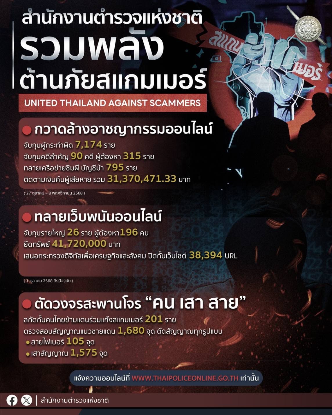ในส่วนของการปราบปรามมีผลการปฏิบัติที่จะนำมาประชาสัมพันธ์ในการแถลงข่าว “รวมพลังคนไทย ต้านภัยสแกมเมอร์” United Thailand Against Scammers ในวันนี้ สรุปได้ดังนี้ ได้ทำการระดมกวาดล้างจับกุมผู้กระทำความผิดเกี่ยวกับอาชญากรรมทางเทคโนโลยีอย่างต่อเนื่องมาโดยตลอด โดยในการระดมกวาดล้างครั้งล่าสุดในห้วงตั้งแต่วันที่ 27 ตุลาคม-8 พฤศจิกายน 2568 (รวม 13 วัน) มีผลการจับกุม รวม 7,044 คดี ผู้ต้องหา 7,174 คน ดังนี้