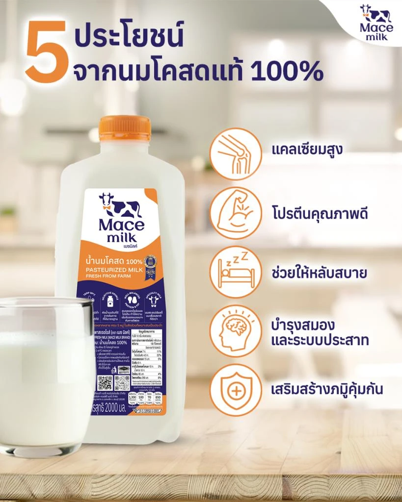 ผู้ผลิตสินค้านํ้านมโคไทย ทุกบริษัทมีความสําคัญต่ออุตสาหกรรมการเลี้ยงโคนมและการส่งเสริมอาชีพให้กับพี่น้องเกษตรกรผู้เลี้ยงโคนมเป็นอย่างมาก ตลอดระยะเวลาที่ผ่านมา Mace Milk ทํางานร่วมกับเกษตรกรไทยมาเป็นระยะเวลานาน โดยให้ความสําคัญกับการดูแลคุณภาพ นานมโคสดในทุกขั้นตอนเพื่อส่งมอบผลิตภัณฑ์ที่ได้มาตรฐานและเหมาะสมสําหรับผู้บริโภค เราให้ความเคารพต่อบทบาทของผู้ผลิตน้ํานมโค ไทยทุกราย ซึ่งล้วนมีส่วนสําคัญต่อความมั่นคงของอุตสาหกรรมโคนมไทยและการพัฒนาวิถีชีวิตของเกษตรกรทั่วประเทศ