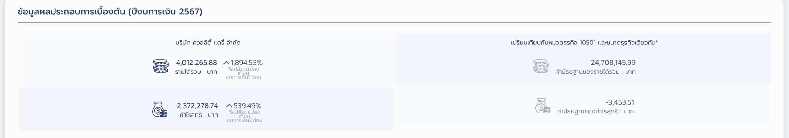 ดอย่างไรก็ตาม แม้รายได้จะเติบโตสูง แต่บริษัทยังไม่สามารถพลิกกลับมาตัวเขียวได้ ขาดทุนสุทธิ -2,372,278.74 บาท เมื่อเทียบกับค่ากลางอุตสาหกรรมในหมวดเดียวกัน (10501) พบว่า