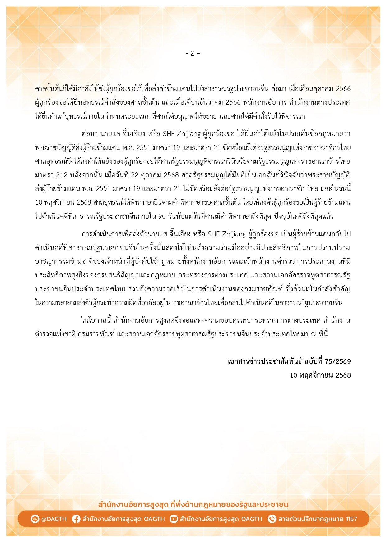 10 พฤศจิกายน 2568 สำนักงานอัยการสูงสุดเปิดเผยความคืบหน้าคดีส่งผู้ร้ายข้ามแดน นายแส จี้นเจียง (SHE Zhijiang) ชาวจีนและกัมพูชา ผู้เป็นเจ้าของบ่อนกาสิโนขนาดใหญ่ฝั่งเมียวดี ประเทศเมียนมา โดยระบุว่า