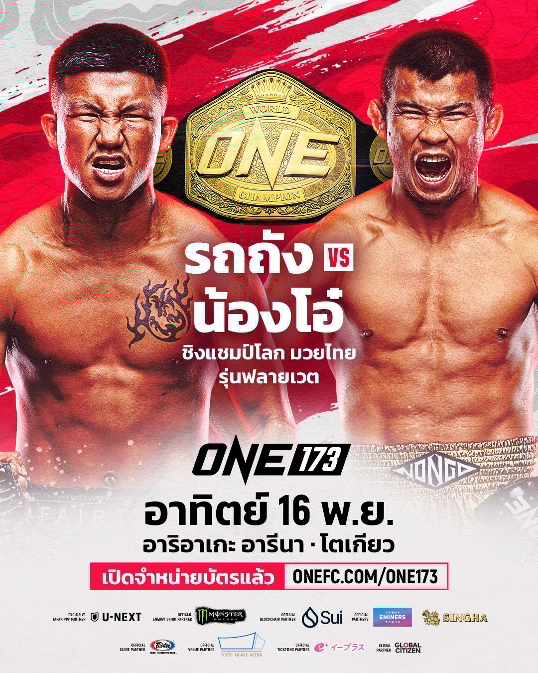 สำหรับแฟนหมัดมวยชาวไทยสามารถติดตามการถ่ายทอดสด ศึก ONE 173 สดจากสนามอาริอาเกะ อารีนา กรุงโตเกียว ประเทศญี่ปุ่น ในวันอาทิตย์ที่ 16 พ.ย.นี้ เริ่มเวลา 11.00 น.