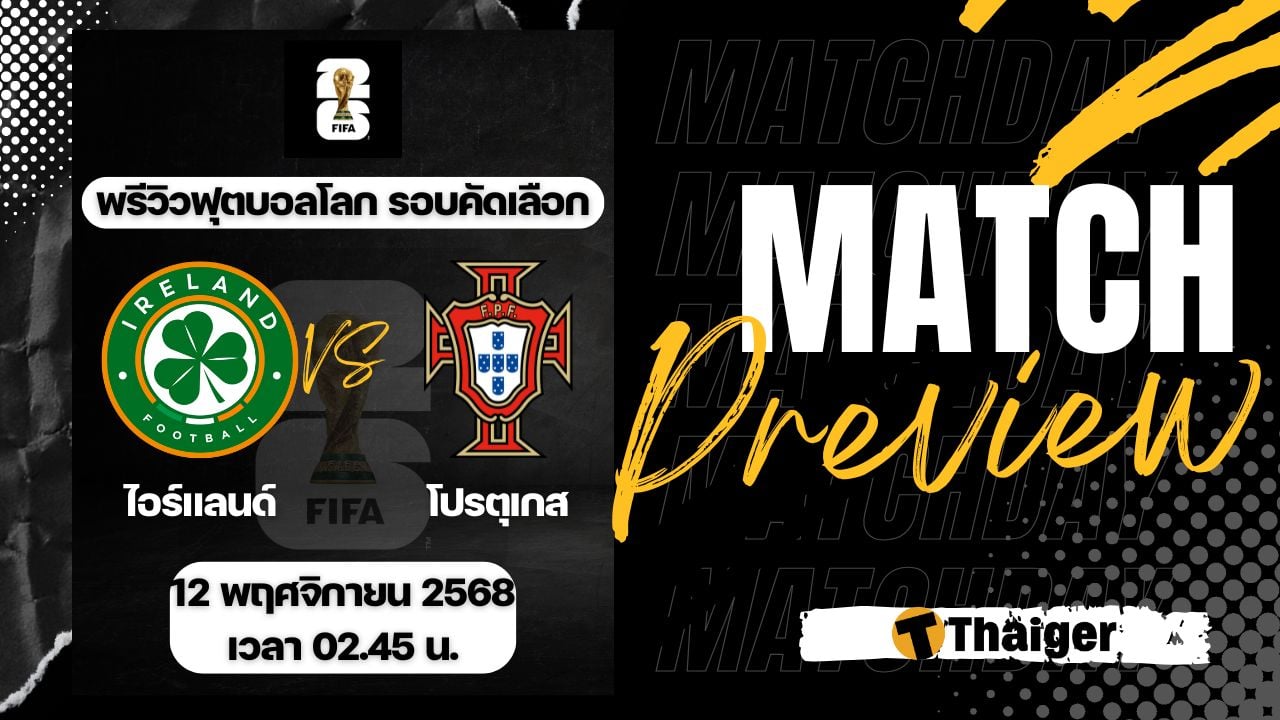 13 พฤศจิกายน 2568 เวลา 02.45 น. ถ่ายทอดสด ดูบอลสด ฟุตบอลโลก 2026 รอบคัดเลือก โซนยุโรป คู่ระหว่าง ไอร์แลนด์ พบ โปรตุเกส The Thaiger พาไปวิเคราะห์เกม พร้อมการทำนายผล และคาดการณ์ 11 ตัวจริงได้ที่นี่