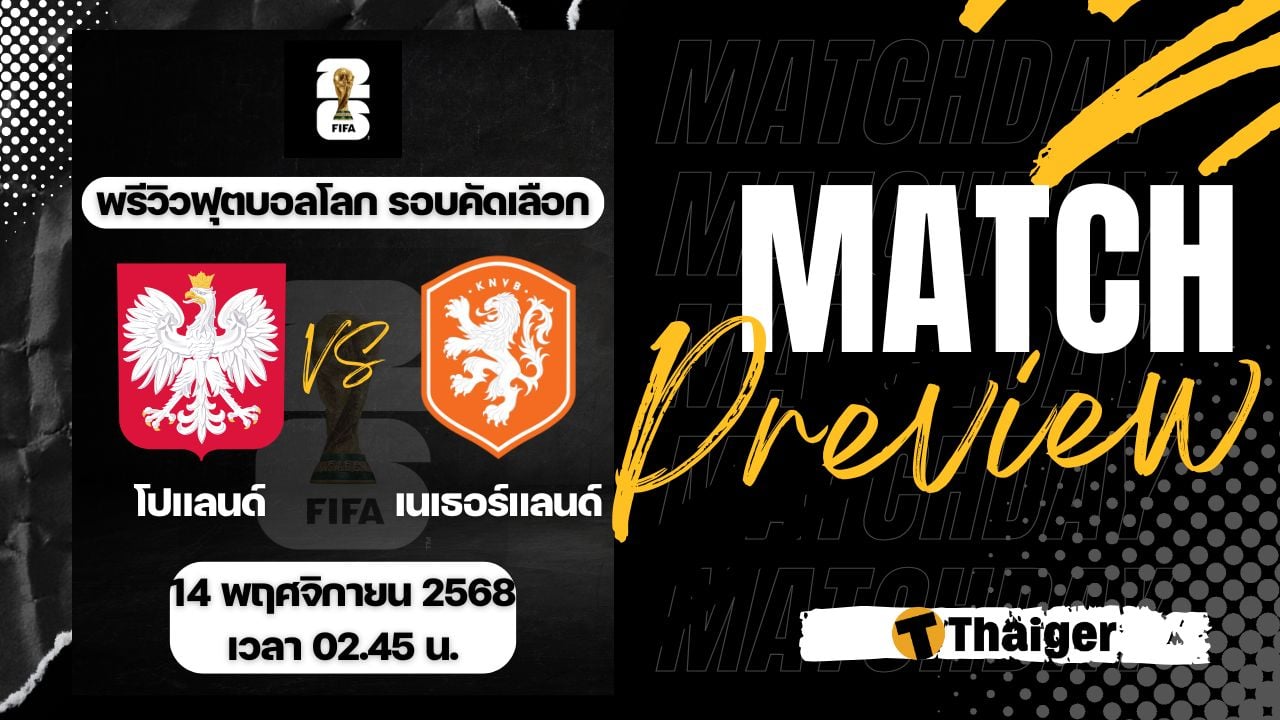 14 พฤศจิกายน 2568 เวลา 02.45 น. ถ่ายทอดสด ดูบอลสด ฟุตบอลโลก 2026 รอบคัดเลือก โซนยุโรป คู่ระหว่าง โปแลนด์ พบ เนเธอร์แลนด์ The Thaiger พาไปวิเคราะห์เกม พร้อมการทำนายผล และคาดการณ์ 11 ตัวจริงได้ที่นี่