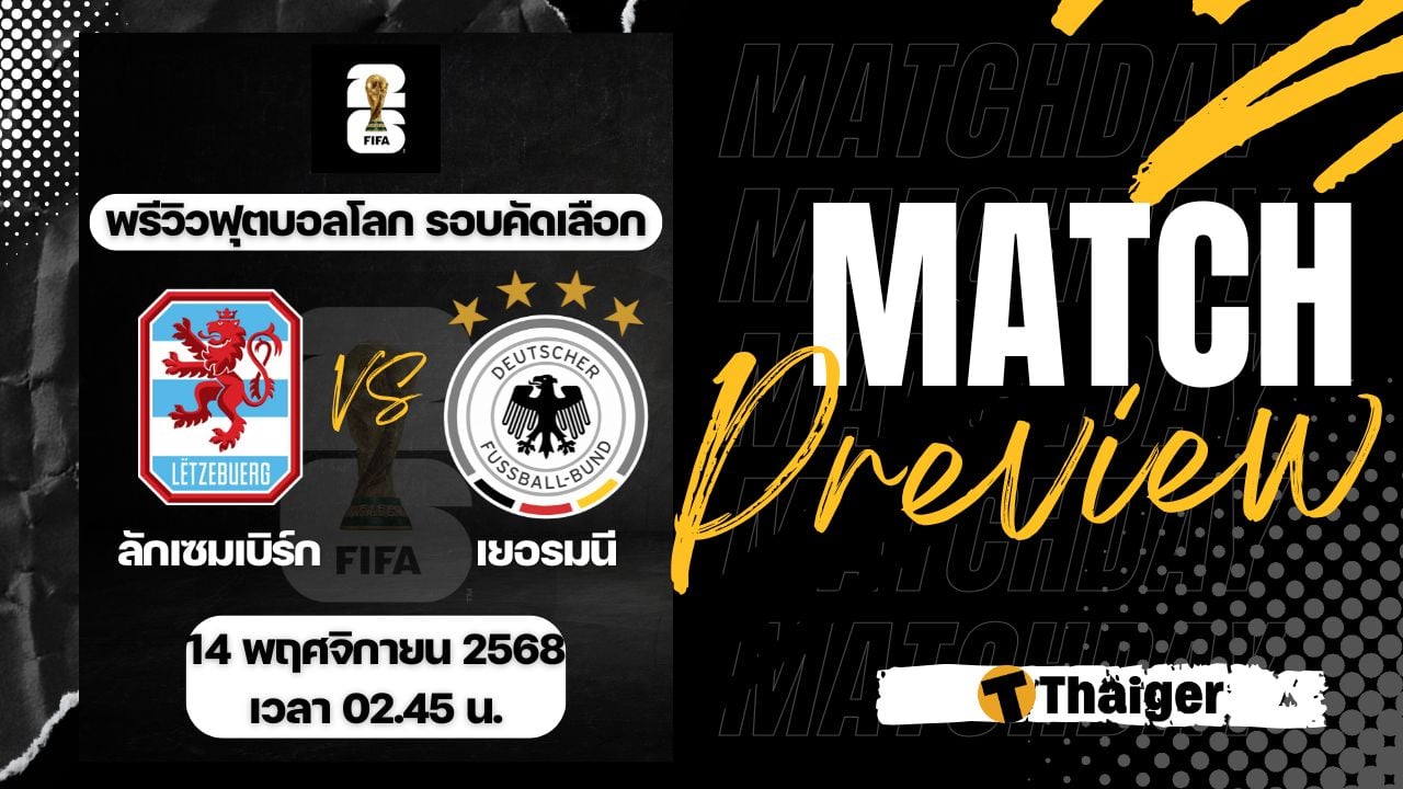 14 พฤศจิกายน 2568 เวลา 02.45 น. ถ่ายทอดสด ดูบอลสด ฟุตบอลโลก 2026 รอบคัดเลือก โซนยุโรป คู่ระหว่าง ลักเซมเบิร์ก พบ เยอรมนี The Thaiger พาไปวิเคราะห์เกม พร้อมการทำนายผล และคาดการณ์ 11 ตัวจริงได้ที่นี่