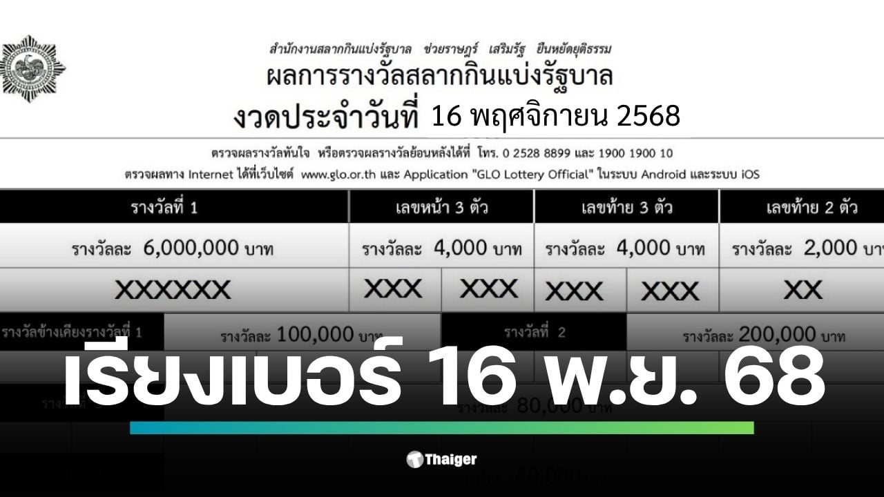 ผลสลากกินแบ่งรัฐบาล วันที่ 16 พ.ย. 68