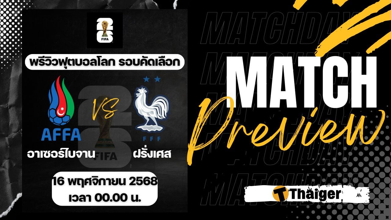 16 พฤศจิกายน 2568 เวลา 00.00 น. ถ่ายทอดสด ดูบอลสด ฟุตบอลโลก 2026 รอบคัดเลือก โซนยุโรป คู่ระหว่าง อาเซอร์ไบจาน พบ ฝรั่งเศส The Thaiger พาไปวิเคราะห์เกม พร้อมการทำนายผล และคาดการณ์ 11 ตัวจริงได้ที่นี่