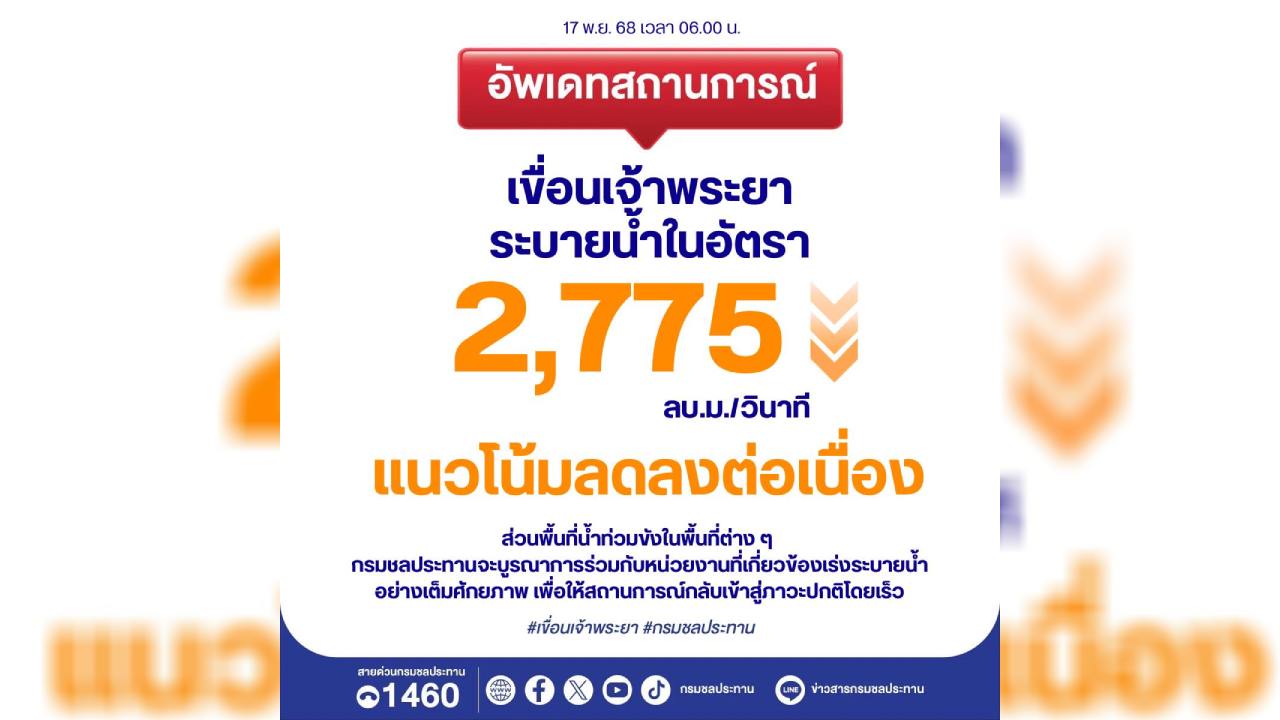 ปริมาณน้ำไหลผ่าน 2,775 ลบ.ม./วินาที (เมื่อวาน 2,800 ลบ.ม./วินาที)