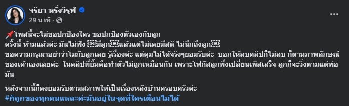 “ขอความกรุณาอย่าว่าโมกับลูกเลย รู้เรื่องค่ะ แต่คุมไม่ได้จริงๆยอมรับค่ะ บอกให้ลบคลิปก็ไม่ลบ ก็ตามภาพลักษณ์ของเค้าเองเลยค่ะ ในคลิปที่ยิ้มคือทำตัวไม่ถูกเหมือนกัน เพราะโฟกัสลูกพึ่งเปลี่ยนเพิสเสร็จ ลูกก็จะวิ่งตามแต่พ่อมัน”