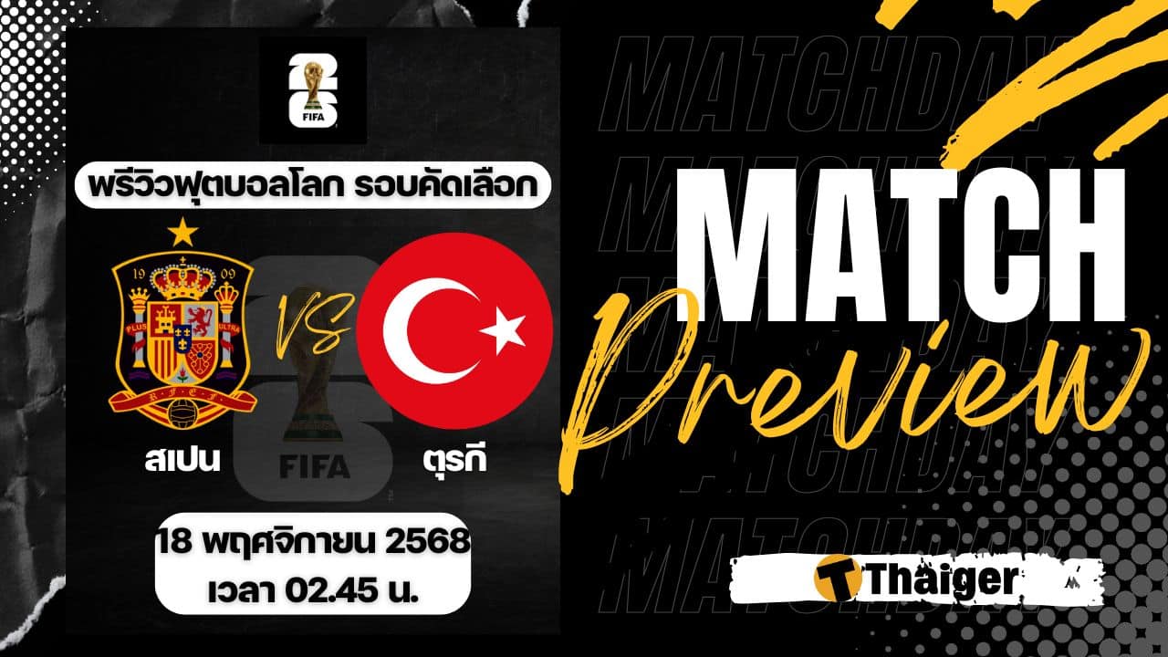 18 พฤศจิกายน 2568 เวลา 02.45 น. ถ่ายทอดสด ดูบอลสด ฟุตบอลโลก 2026 รอบคัดเลือก โซนยุโรป คู่ระหว่าง สเปน พบ ตุรกี The Thaiger พาไปวิเคราะห์เกม พร้อมการทำนายผล และคาดการณ์ 11 ตัวจริงได้ที่นี่