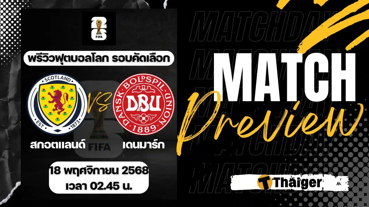 18 พฤศจิกายน 2568 เวลา 02.45 น. ถ่ายทอดสด ดูบอลสด ฟุตบอลโลก 2026 รอบคัดเลือก โซนยุโรป คู่ระหว่าง สกอตแลนด์ พบ เดนมาร์ก The Thaiger พาไปวิเคราะห์เกม พร้อมการทำนายผล และคาดการณ์ 11 ตัวจริงได้ที่นี่