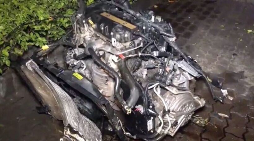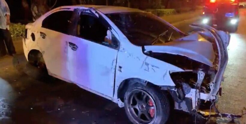 สาวควบเก๋งพุ่งอัดต้นปาล์มโค่น รถพังยับ เครื่องยนต์หลุดจากเบ้า เจ้าตัวยังงงๆ