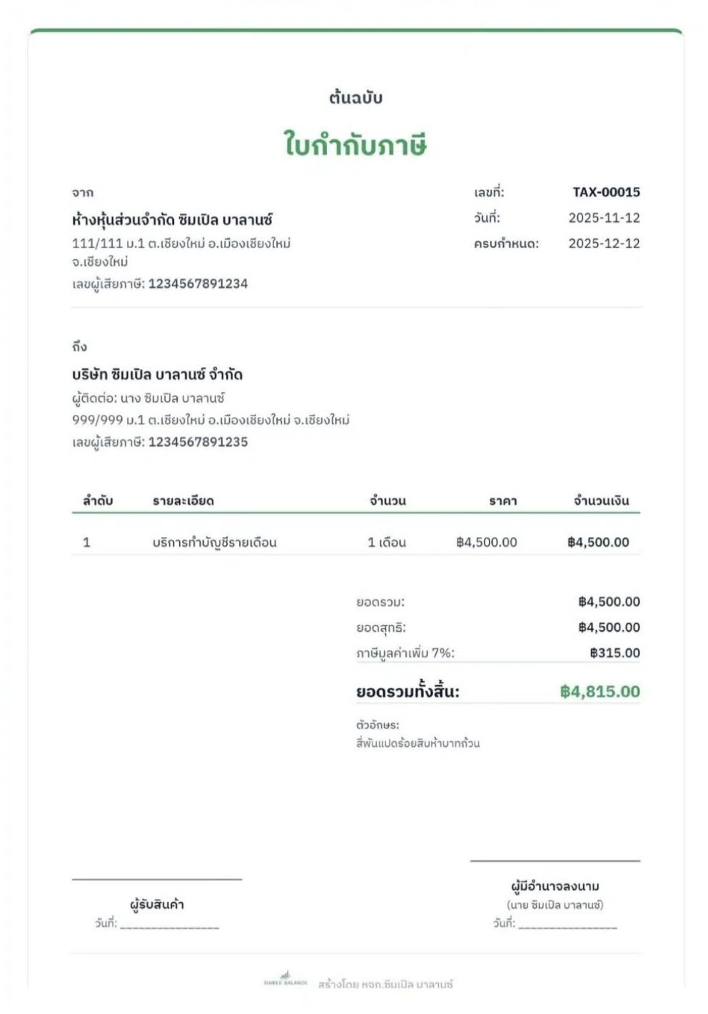 - ใบกำกับภาษี: TAX-00001, TAX-00002, …