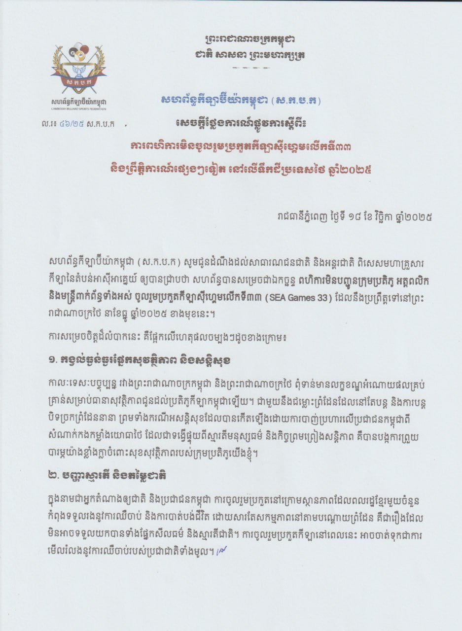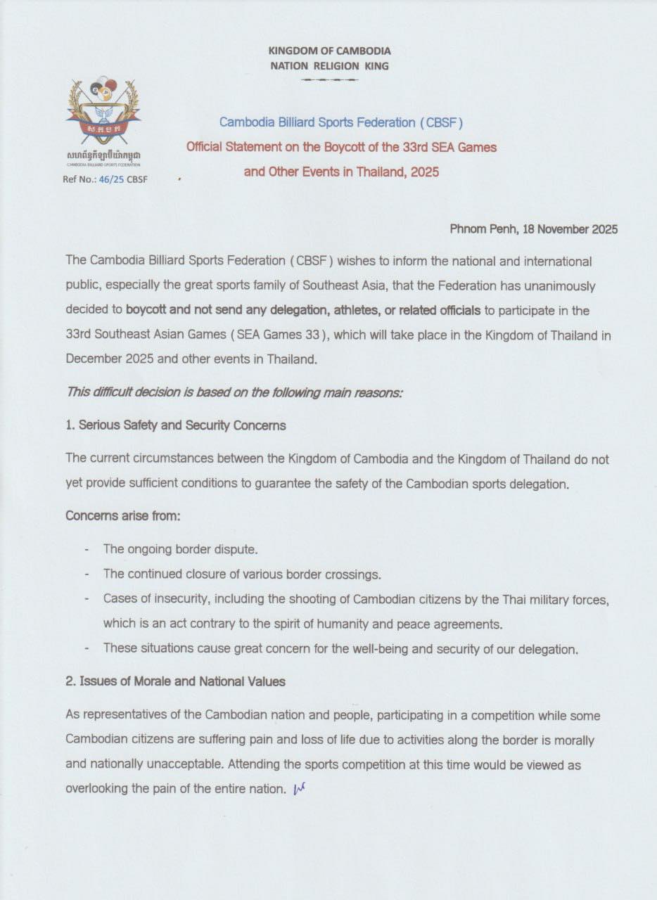สหพันธ์กีฬาบิลเลียดแห่งกัมพูชา (CBSF) ออกแถลงการณ์อย่างเป็นทางการ จะไม่ส่งนักกีฬาร่วมทำการแข่งขัน ซีเกมส์ 2025 ที่ประเทศไทย อ้างกังวลเรื่องความปลอดภัย